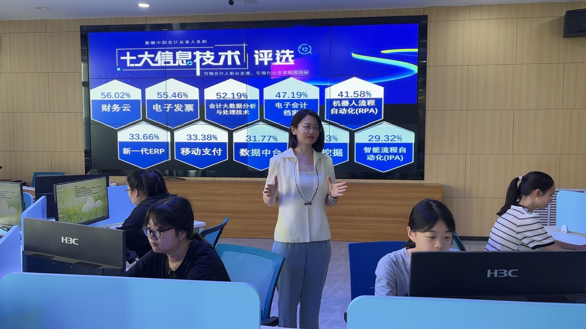 备赛期间,白玉翠以高度的责任感和使命感全身心投入。她深入研究专业人才培养目标与行业发展趋势,精准把握大赛要求。为了将智能财税前沿技术与课程教学深度融合,她与团队反复研讨,白天深入企业调研实际工作场景,收集真实案例;晚上加班加点设计教学方案,常常工作到深夜。在课程设计环节,她大胆创新,将传统的会计教学与大数据、人工智能等新技术相结合,打造出“理论+实践+数智化”的新型教学模式。为了让学生更好地理解复杂的业财税工作流程,她运用虚拟仿真技术,构建了高度还原企业财税工作的虚拟场景,让学生在沉浸式学习中掌握专业技能。