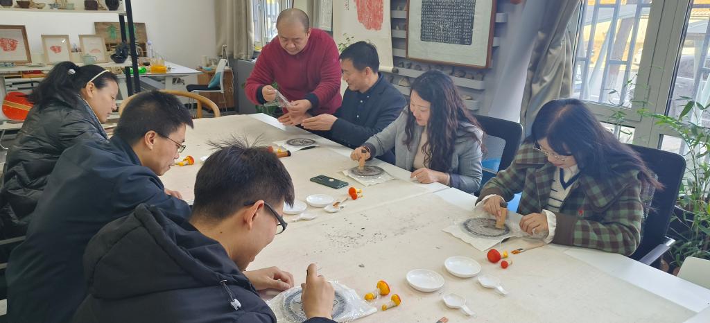 河北交通职业技术学院汽车工程系一行还参观了王丽云剪纸技术技能大师工作室、方士英石影雕技术技能大师工作室以及教师第一党支部“双带头人”工作室,并现场体验了金石传拓文创产品的制作。