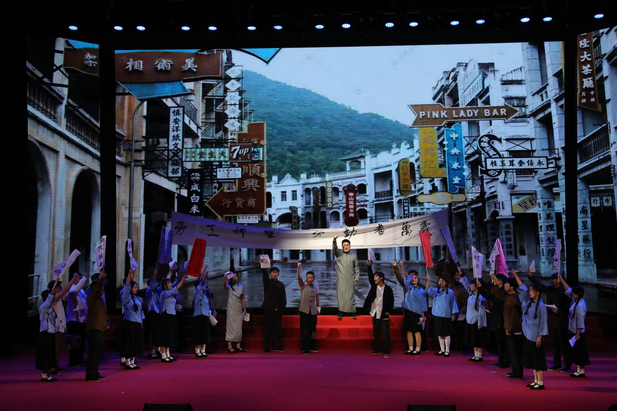 11月14日晚,昭徳礼堂,星光璀璨。庆祝中华人民共和国成立75周年暨马克思主义学院思政课实践教学成果汇演《追寻·初心》第三届红色舞台剧隆重上演。学院领导许征程、马福恒、赵伟、刘占红、赵惠娟、王志明、范成宝与广大师生一同现场观看演出。