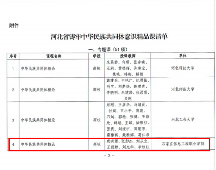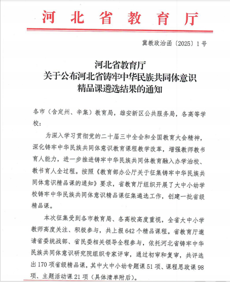 近日,按照《教育部办公厅关于征集铸牢中华民族共同体意识精品课的通知》要求,河北省教育厅组织开展铸牢中华民族共同体意识精品课征集遴选,创建一批省级精品课,我院马克思主义学院选送的《中华民族共同体概论》专题课成功入选河北省省级精品课。