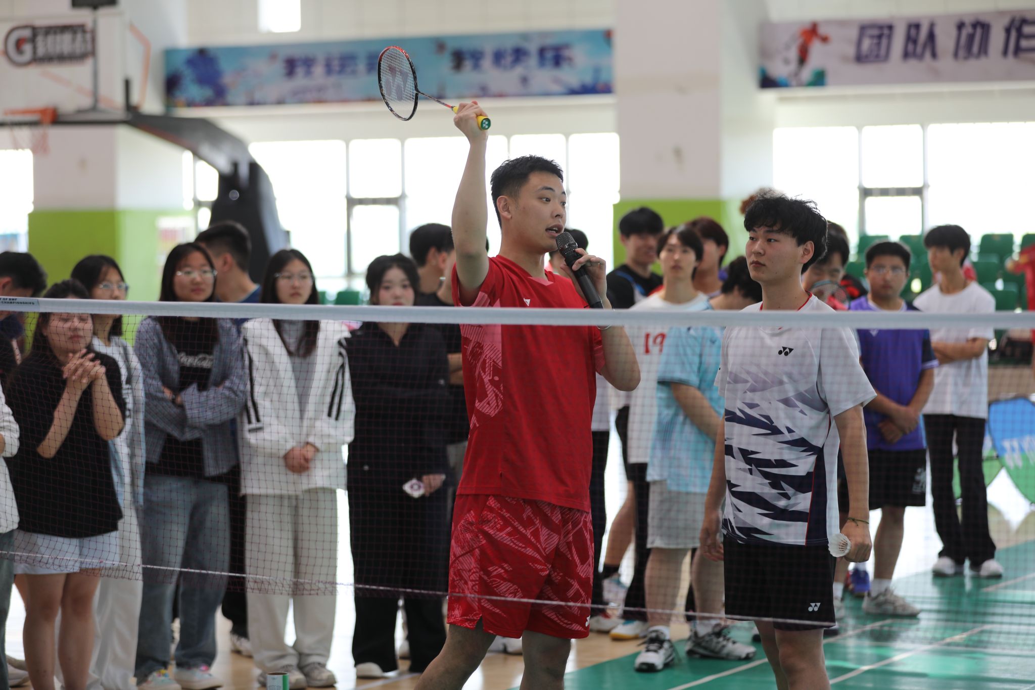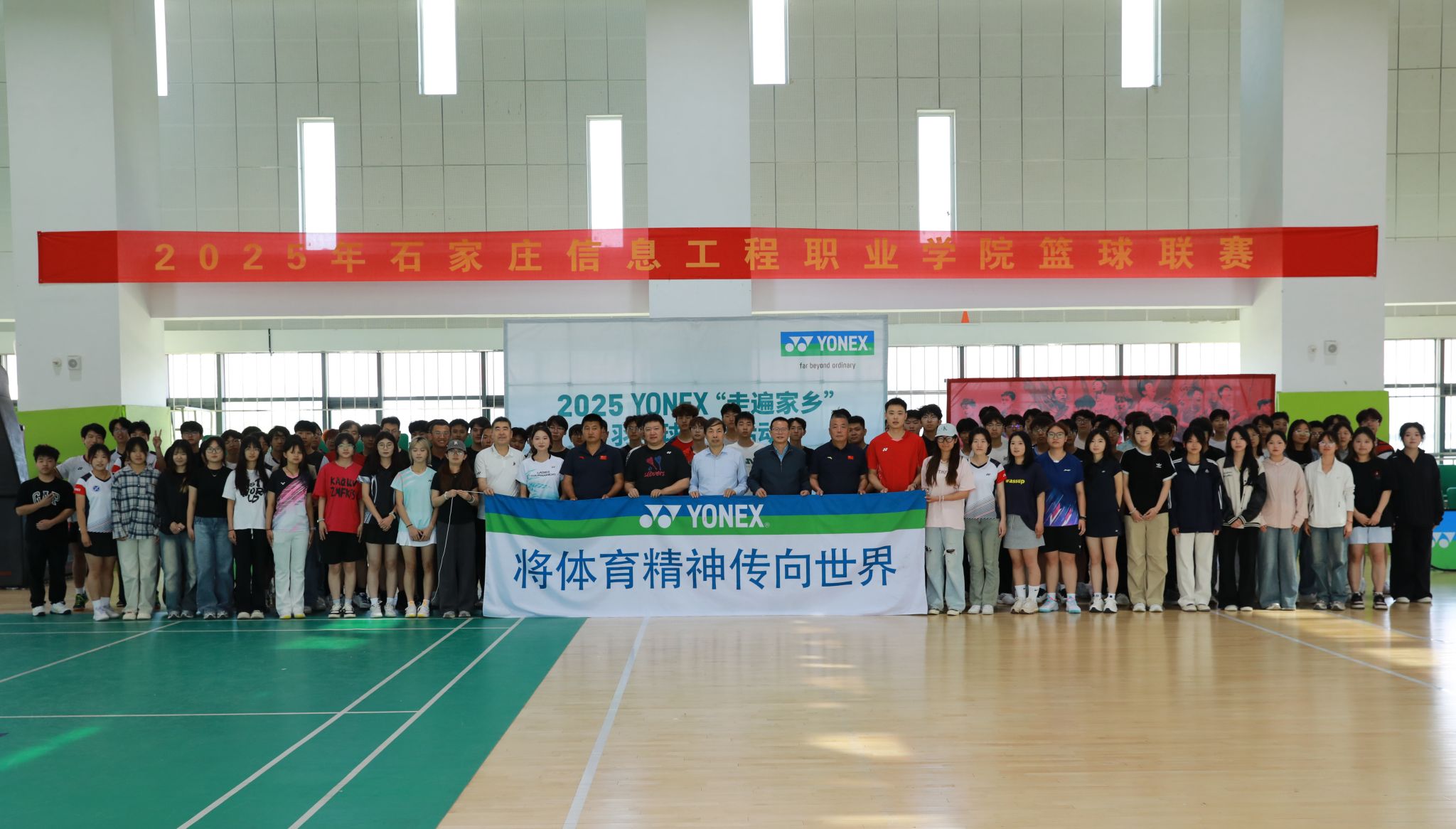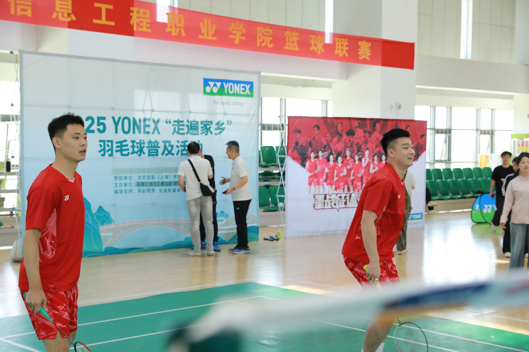 5月24日上午,2025年“走遍家乡”尤尼克斯羽毛球普及活动走进我院,在天健体育馆为师生羽毛球爱好者们带来了一场羽毛球运动交流活动。我院副院长刘占红,党委委员、范成宝,石家庄市曲协副主席、洪顺曲艺社总经理、著名相声演员周培岩,原安徽省羽毛球队主力队员、国家一级运动员王鑫哲,石家庄锐特商城总经理张建明出席活动。体育部相关负责人及100余名师生参加。