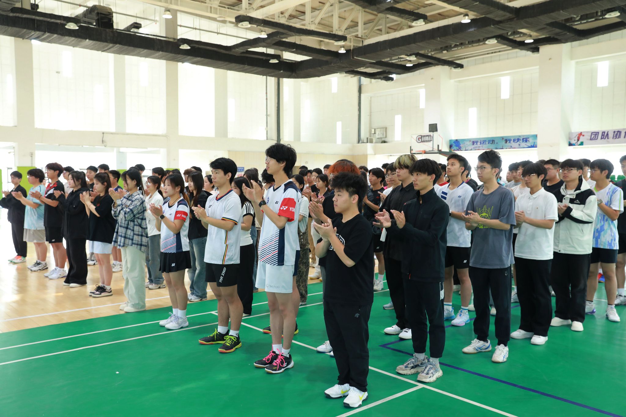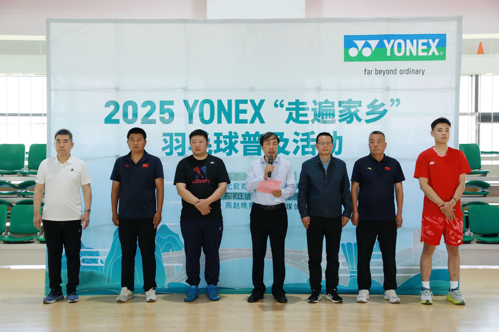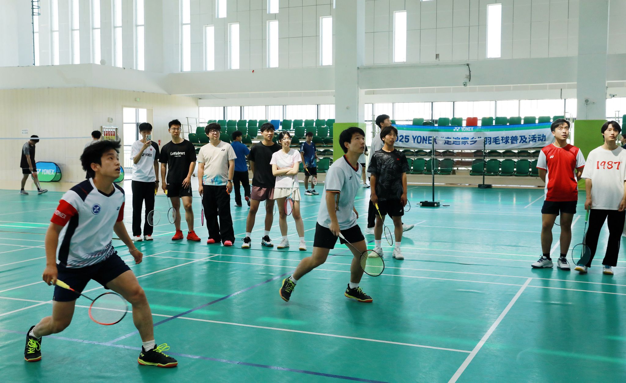 5月24日上午,2025年“走遍家乡”尤尼克斯羽毛球普及活动走进我院,在天健体育馆为师生羽毛球爱好者们带来了一场羽毛球运动交流活动。我院副院长刘占红,党委委员、范成宝,石家庄市曲协副主席、洪顺曲艺社总经理、著名相声演员周培岩,原安徽省羽毛球队主力队员、国家一级运动员王鑫哲,石家庄锐特商城总经理张建明出席活动。体育部相关负责人及100余名师生参加。