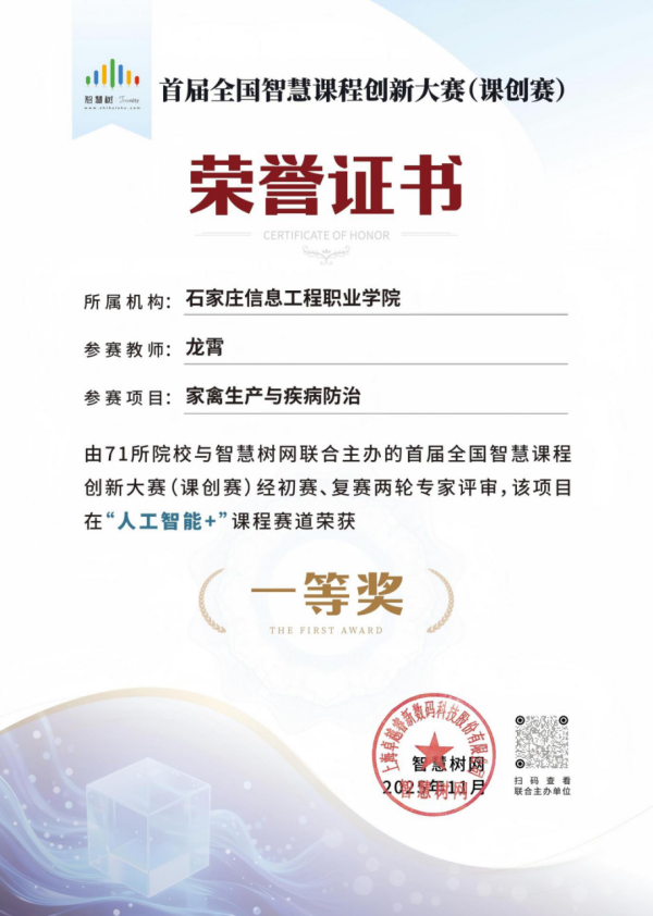 近日,首届“智慧树杯” 全国智慧课程创新大赛结果正式揭晓。我院农林牧医系龙霄老师凭借《家禽生产与疾病防治》课程的创新设计与实践成果,在全国400余所高校、1500余份参赛材料中脱颖而出,成功斩获“人工智能+”课程一等奖。