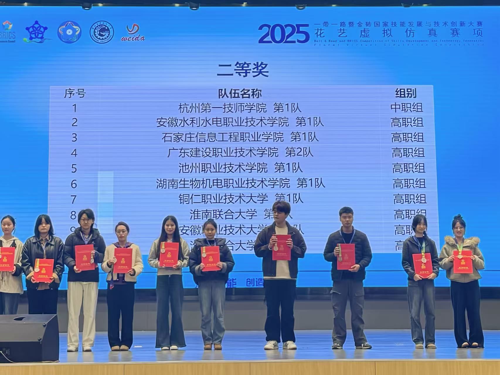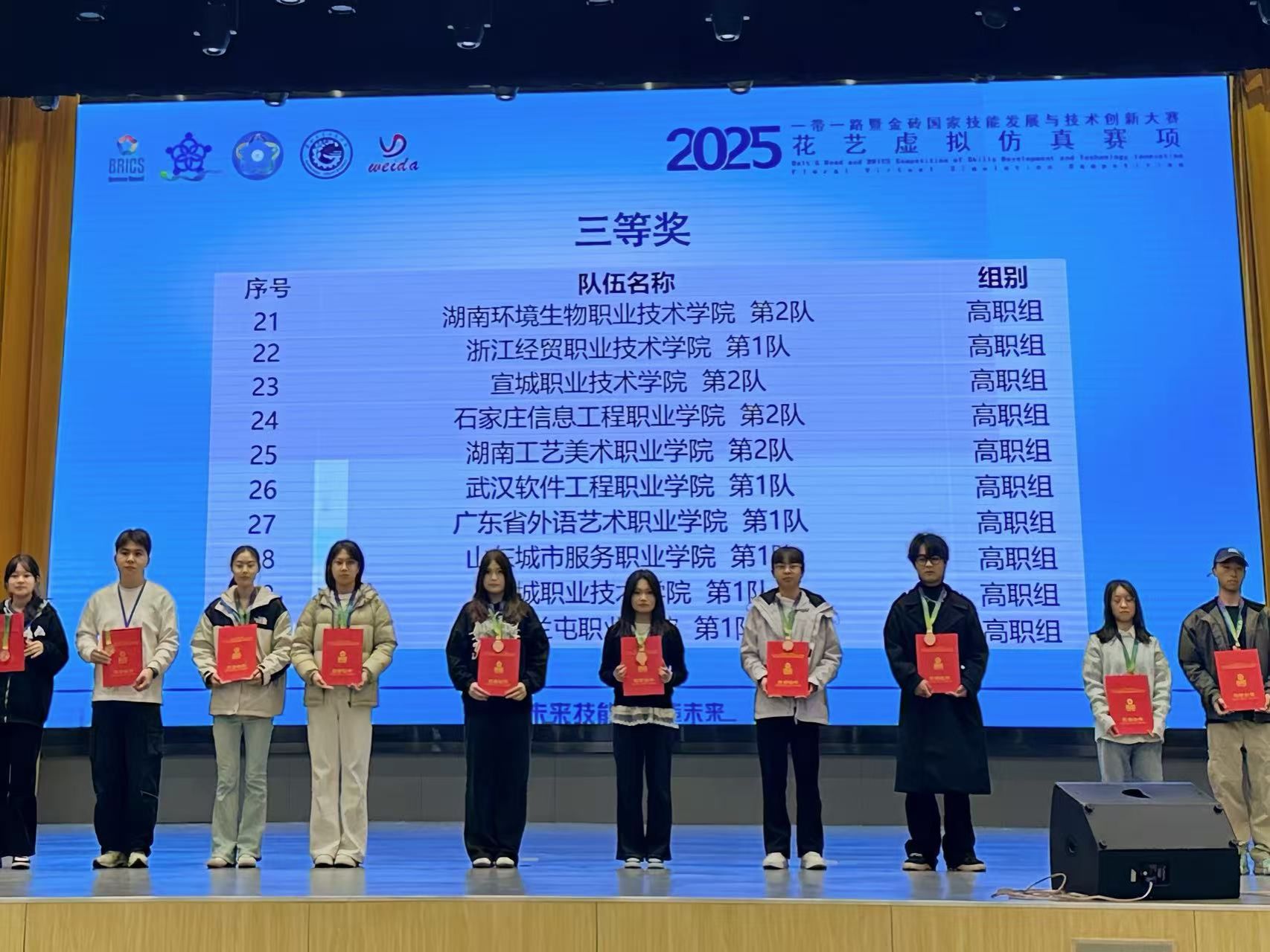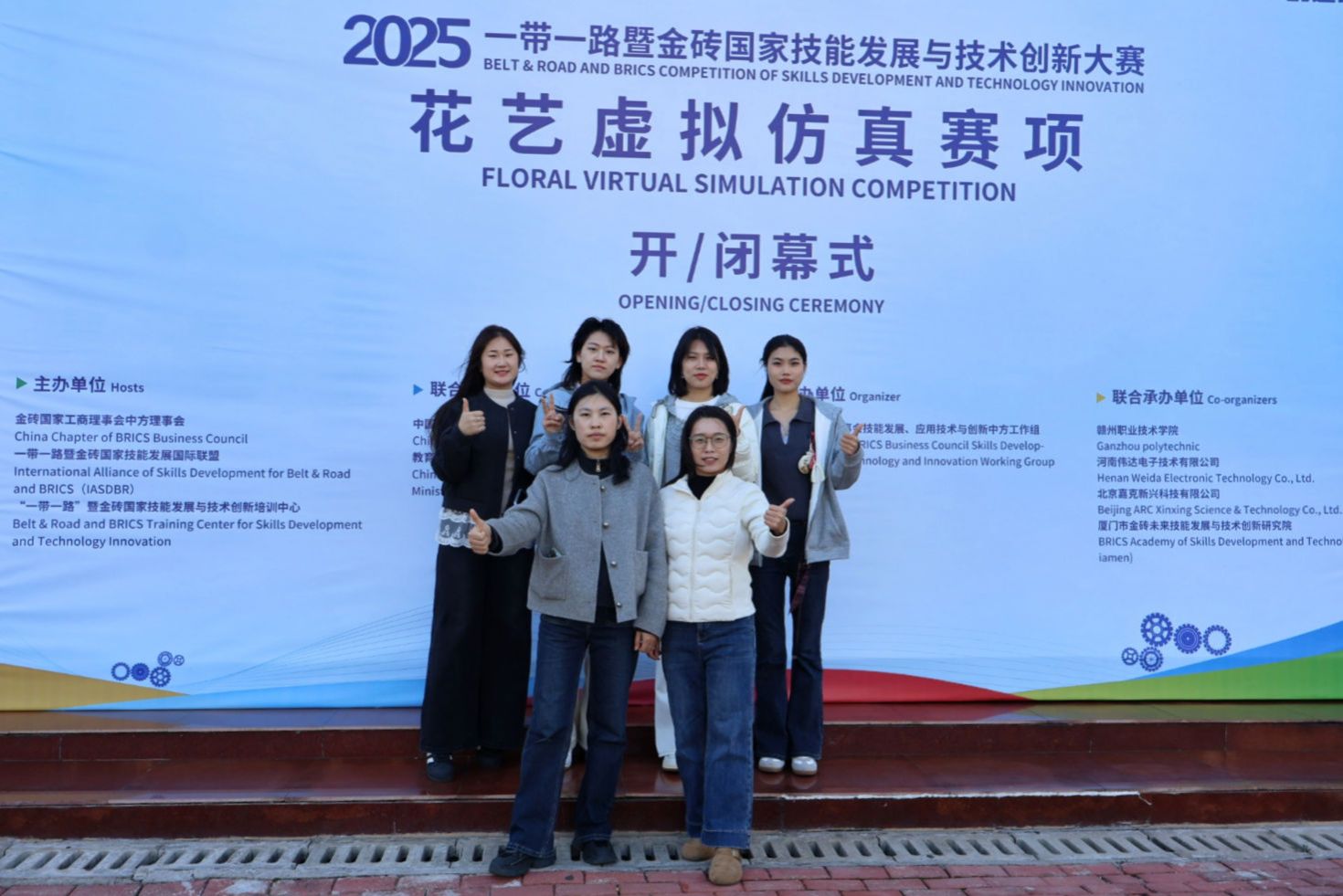 11月23日,2025一带一路暨金砖国家技能发展与技术创新大赛花艺虚拟仿真赛项(高职组)在赣州职业技术学院顺利举行。我院农林牧医系园林技术专业学生鲁婧媛、汤鑫蕊、王梓茜、赵宇萌(指导教师董彦娜、姚君君)组成的两支参赛团队发挥出色,分别荣获全国二等奖、三等奖奖,我院荣获优秀组织奖。