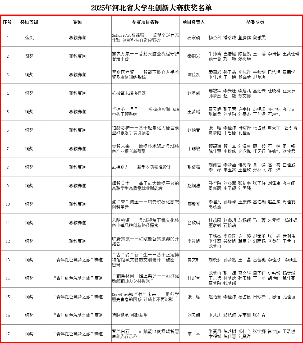 近日,河北省教育厅公布了2025年河北省大学生创新大赛获奖名单,我院取得1项金奖、1项银奖、15项铜奖的优异成绩。此次成绩的取得充分展现了我校学子扎实过硬、勇于突破的创新实践能力。