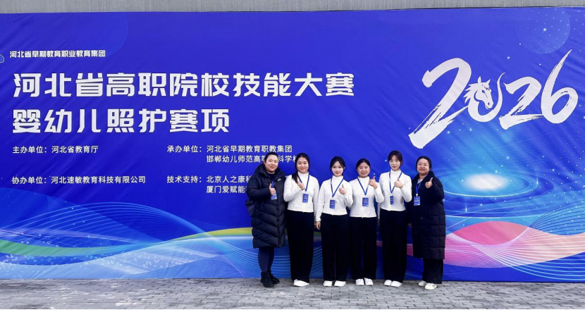 近日,2026年河北省高职院校技能大赛婴幼儿照护赛项在邯郸幼儿师范高等专科学校圆满落幕。由生物医药技术系婴幼儿托育服务与管理专业何若雪、高子甜、沈敏、李颖四位同学组成的参赛团队,在王乐和蔡亚欣老师的指导下,凭借扎实的专业功底、娴熟的实操技能与默契的团队协作,从全省众多参赛队伍中脱颖而出,荣获二等奖。