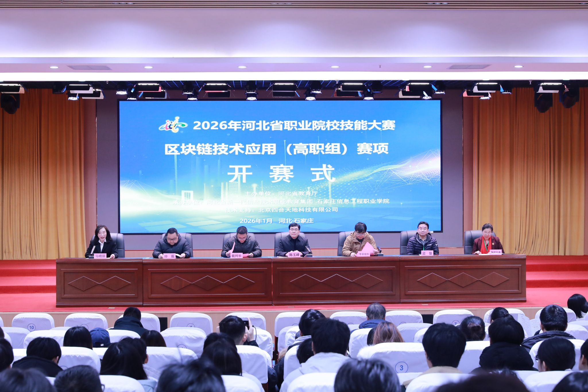 1月5日至6日,2026年河北省职业院校技能大赛区块链技术应用(高职组)赛项在我院顺利举行。本次大赛由河北省教育厅主办,河北省新一代信息技术职业教育集团与我院联合承办,吸引了来自全省25所高职院校的48支代表队,共263名师生同台竞技。学院副院长陈玉峰出席本次大赛开幕式并致辞。