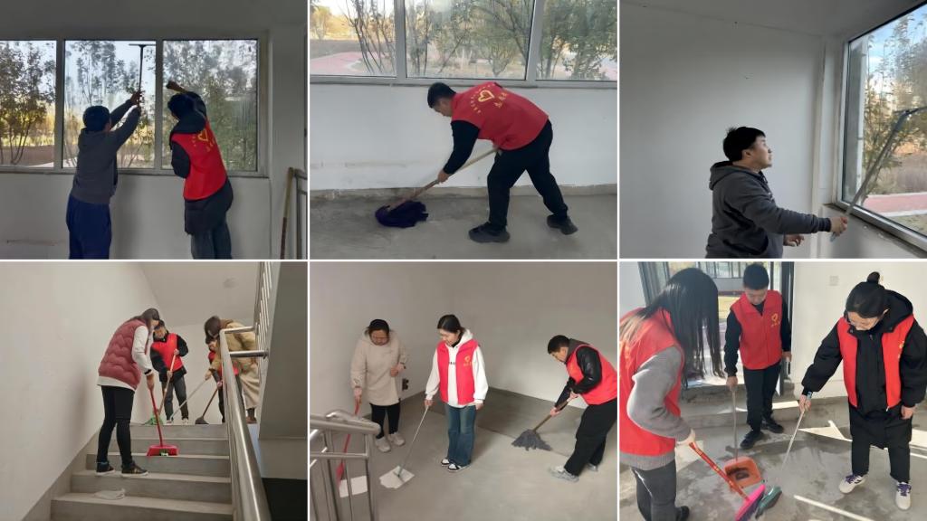 此次活动分为五支志愿小队,对打扫清洁区域进行细致分工后,志愿者们便展开了行动。大家身穿红马甲,个个都充满了干劲,积极发扬奉献精神,他们拿着扫把、簸箕、拖把、喷壶、刮水器等清洁工具,认真地清理起纸屑、塑料瓶、易拉罐等垃圾杂物。师生们不怕脏、不怕累,清理完成后将垃圾收集带走,让每一个卫生死角都变得干干净净。