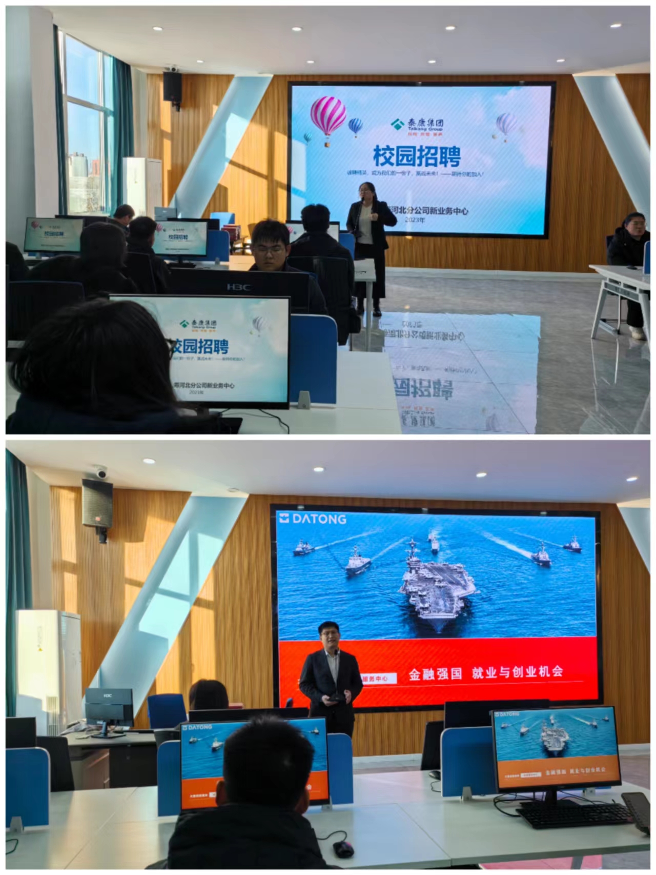 为推动2024届毕业生就业工作,12月21日,会计系邀请大童保险服务河北分公司、泰康人寿保险有限责任公司河北分公司在知新3号楼金融科技创新智慧实训中心召开专场招聘宣讲会。会计系教师第二党支部和金融社共同主办,2021级金融服务与管理专业、金融科技应用专业学生参加。