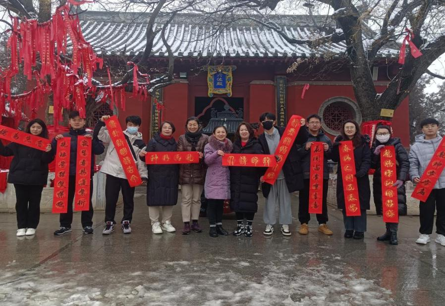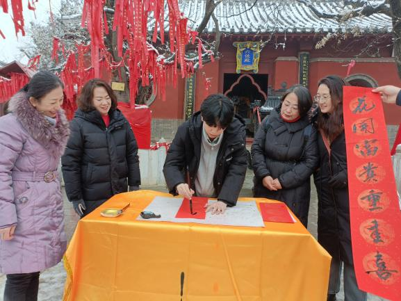 在研学之旅即将结束之时,雪不知何时已悄然停驻。“伏羲开悟天人和,画卦启明传古今”,师生们在晶莹剔透的雾凇琼枝下,伴着雪压折枝声,展宣蕴墨,迎春送福,书写了一副又一副龙年春联,并赠予伏羲台。