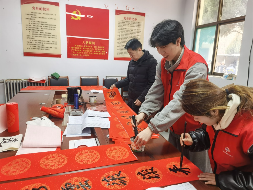 腊八节过后,春节的序幕缓缓拉开。冬日的转角沟村,苍山残雪,薄雾袅袅。虽然寒气清冽彻骨,但是丝毫没有抵挡住志愿者们的服务热情。到达目的地,志愿者们顾不上休息,第一时间便开始裁纸铺宣,倒墨润笔。挥毫列锦绣,落纸如云烟,不到一会儿工夫,便洋洋洒洒书写了上百副春联,村民们纷纷点赞,感谢志愿者们为他们送来的新春祝福。