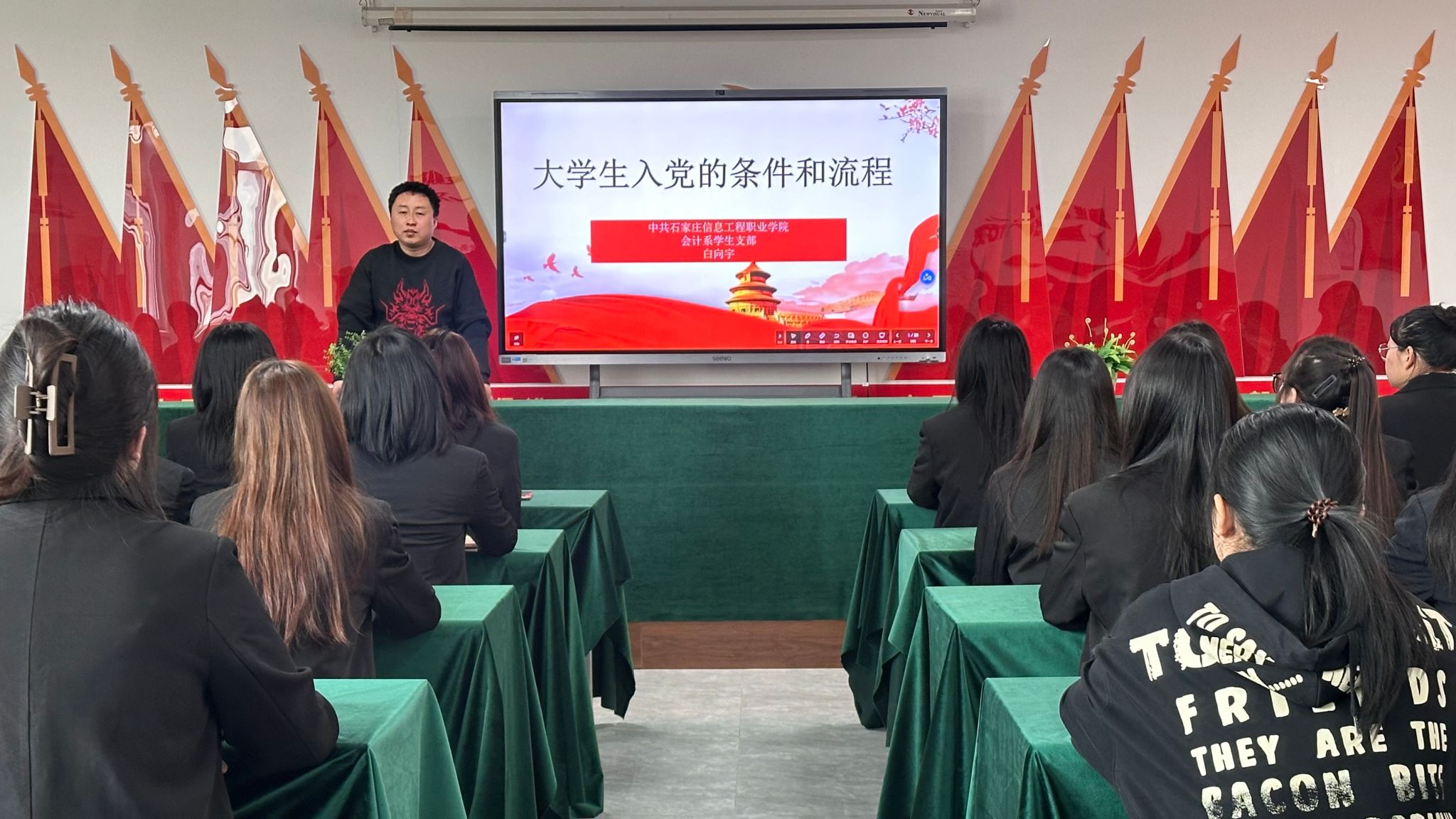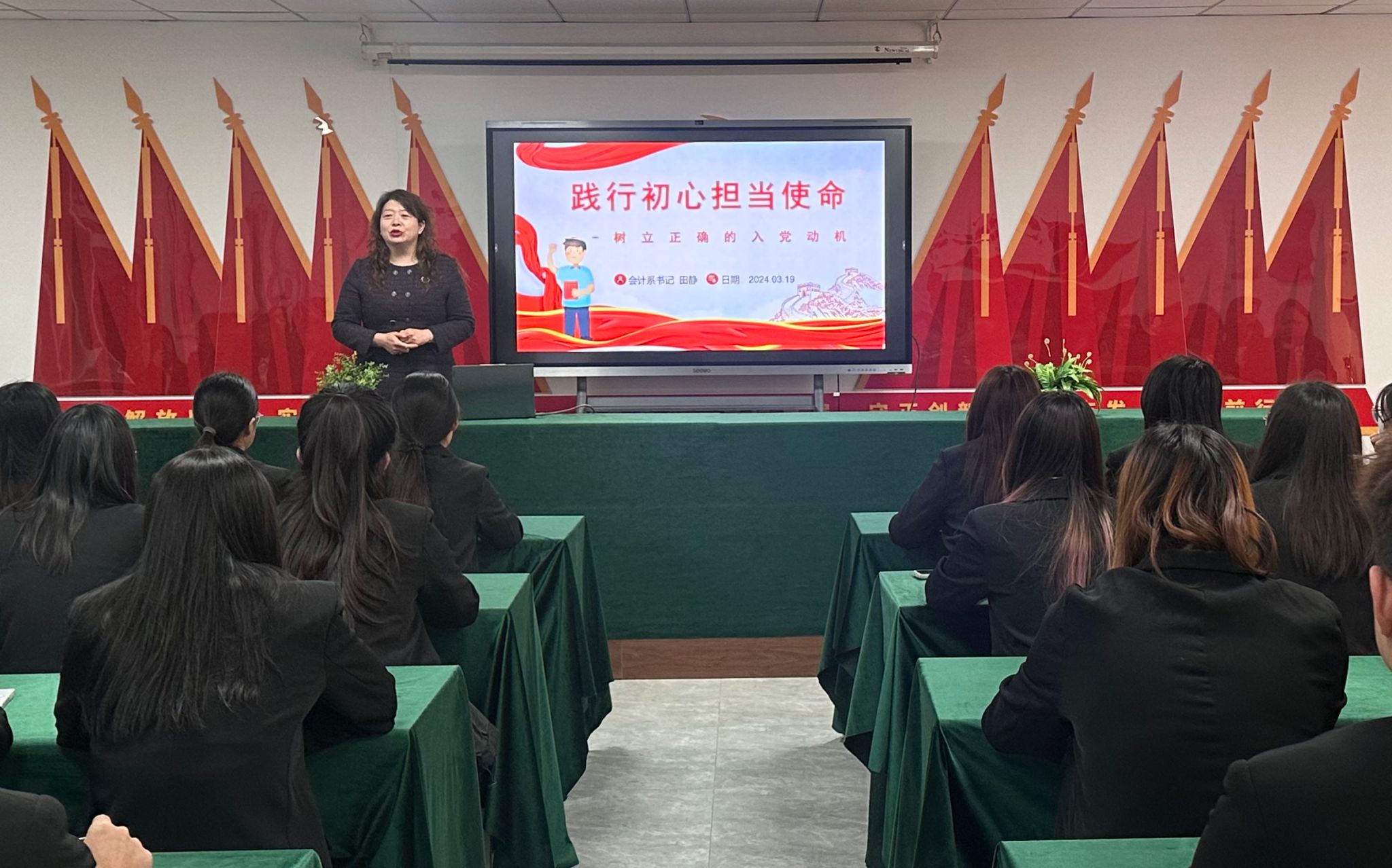 3月19日,会计系党总支书记田静以《践行初心,担当使命——树立正确的入党动机》为题给同学们带来一次精彩的党课。她要求同学们应具备为实现共产主义而奋斗终生的坚定理想信念,树立全心全意为人民服务的思想,具备在各方面起先锋模范作用的觉悟。