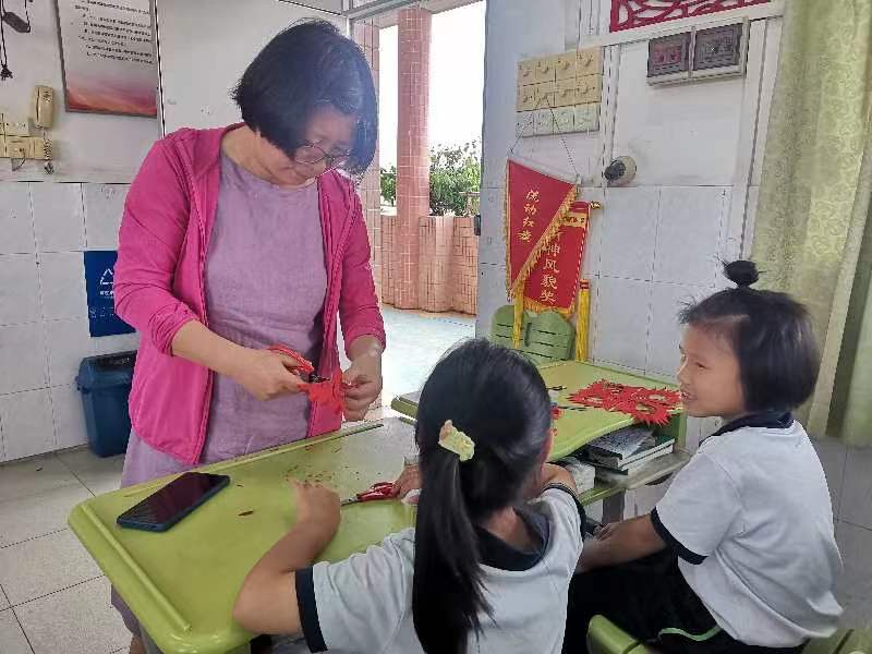 作为校际交流的第二站,团队还来到广州市荔湾区第三批中小学剪纸教育实践基地——广州市真光中学附属西塱小学,与该校《剪纸》第二课堂的任课教师一起,进行了四折团花的教学实践。王丽云老师亲自示范了折、剪的主要过程,用朴实生动的语言详细地讲解了每步要点和注意事项,大家聚精会神地学习,不时发出惊叹和掌声。学生们尽情发挥自己的想象力,与同伴共同分享剪纸带来的乐趣。