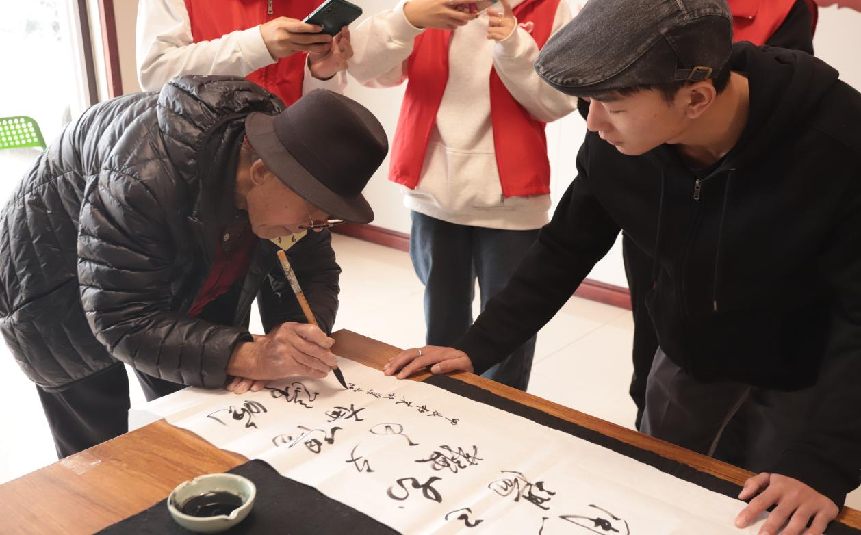 临别之际,养老院蔡爷爷、佟爷爷与志愿者进行书法创作交流,将写有“学无止境”“老骥已知夕阳晚 不用扬鞭自奋蹄”的书法作品,作为祝福和激励送给志愿者们。志愿者也将真诚祝福凝聚在写有“人寿年丰”“平安喜乐”的书法作品中赠予养老院,祝福老人平安顺遂、安度晚年。