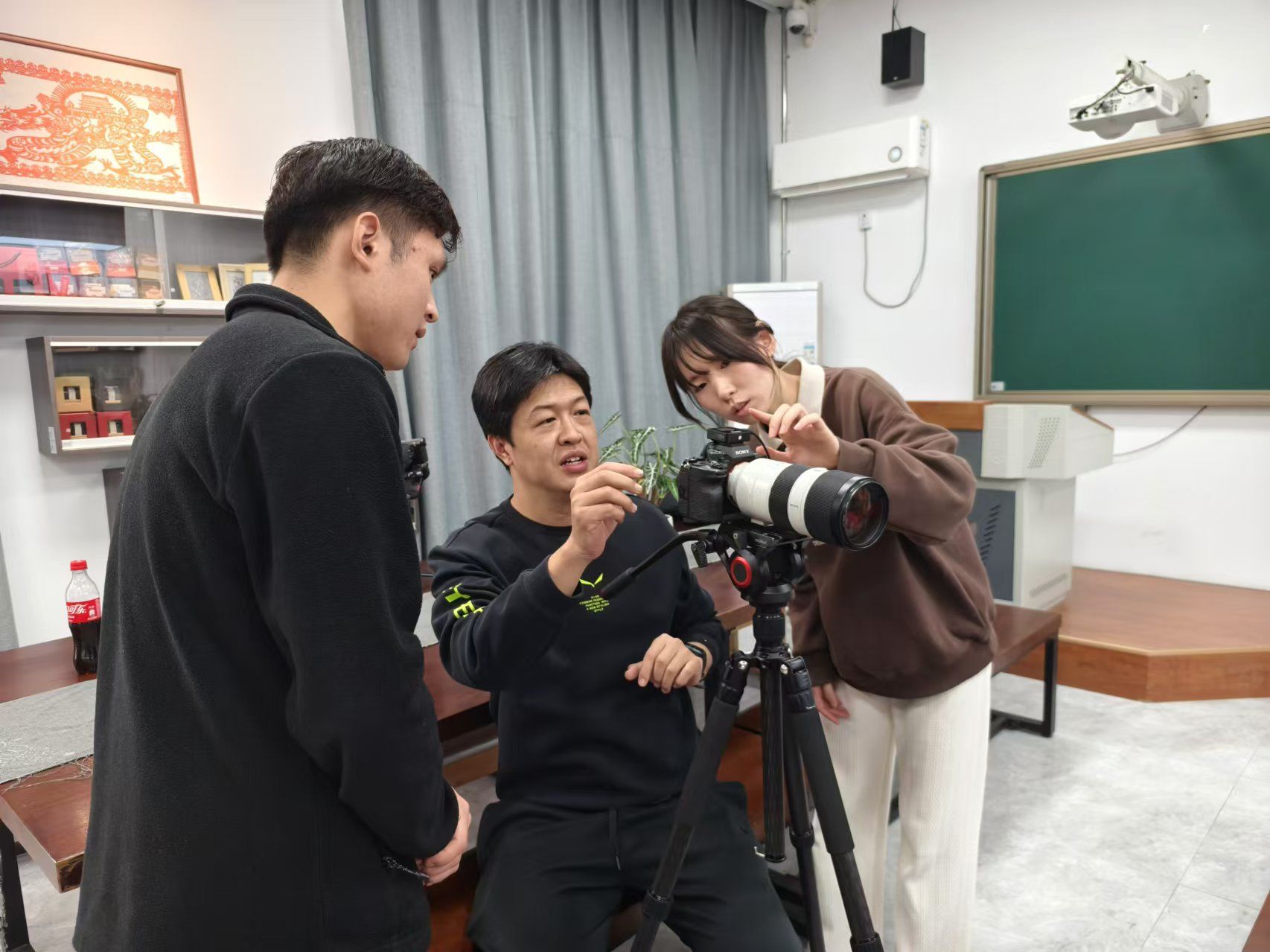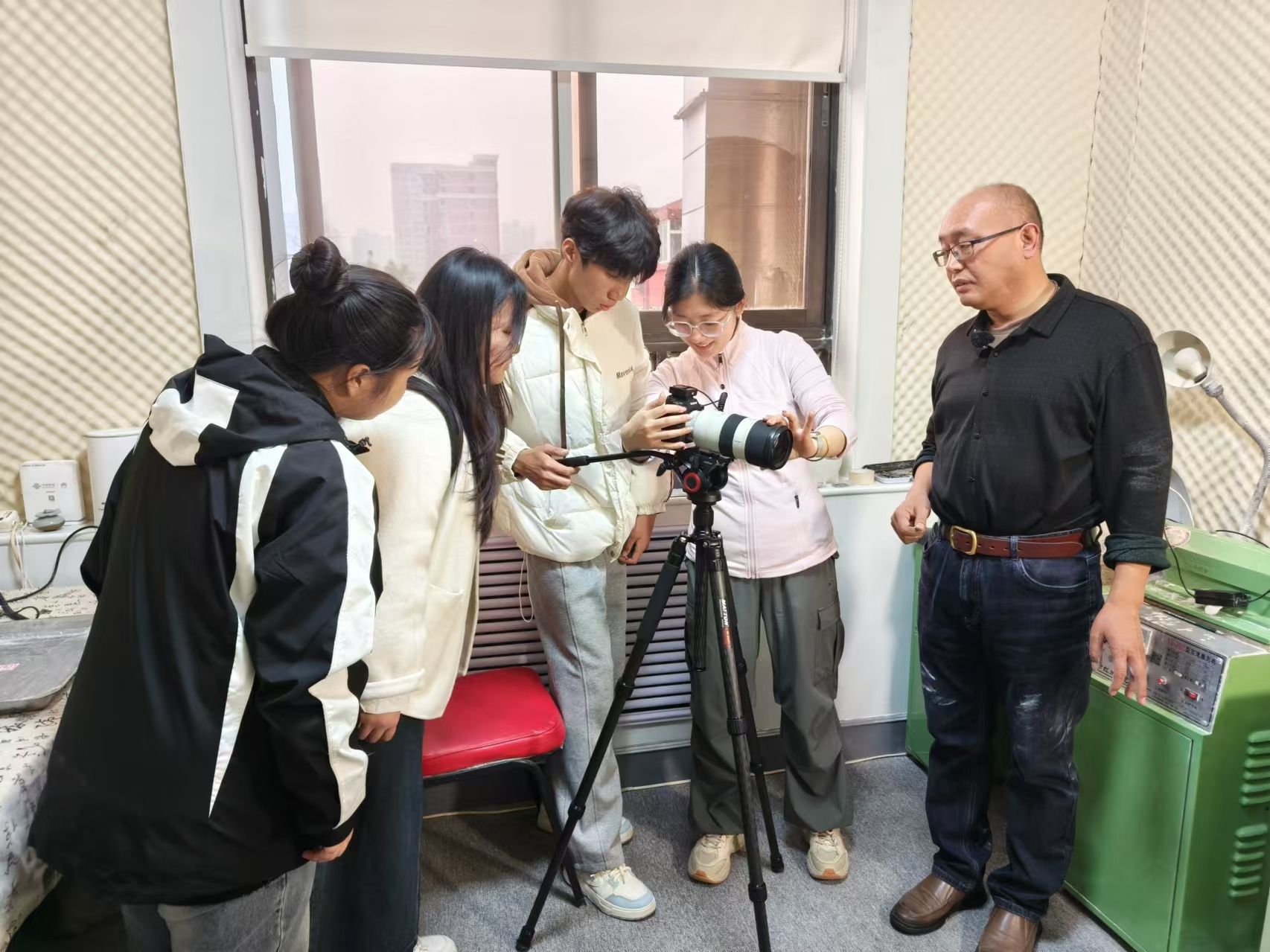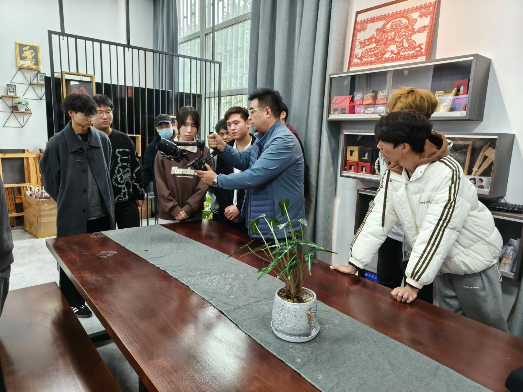 石家庄日报社融媒体中心视频部主任王林及多位技术骨干在拍摄现场手把手教学,详细展示拍摄技巧,就摄影机画幅、光线、景物和距离的变化,光圈的调整等进行亲自示范。