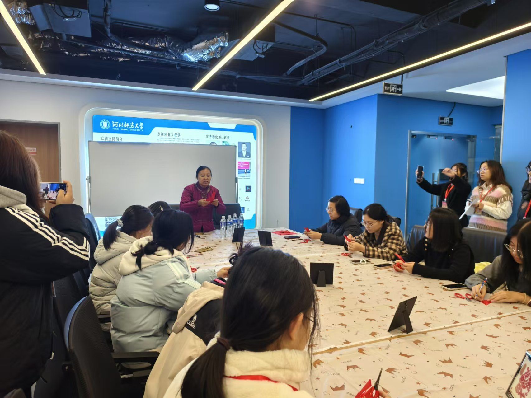 受河北师范大学学生处的邀请,11月13日晚,传媒艺术系王丽云剪纸技术技能大师工作室团队来到该校开展“心随手动”创意剪纸志愿服务。