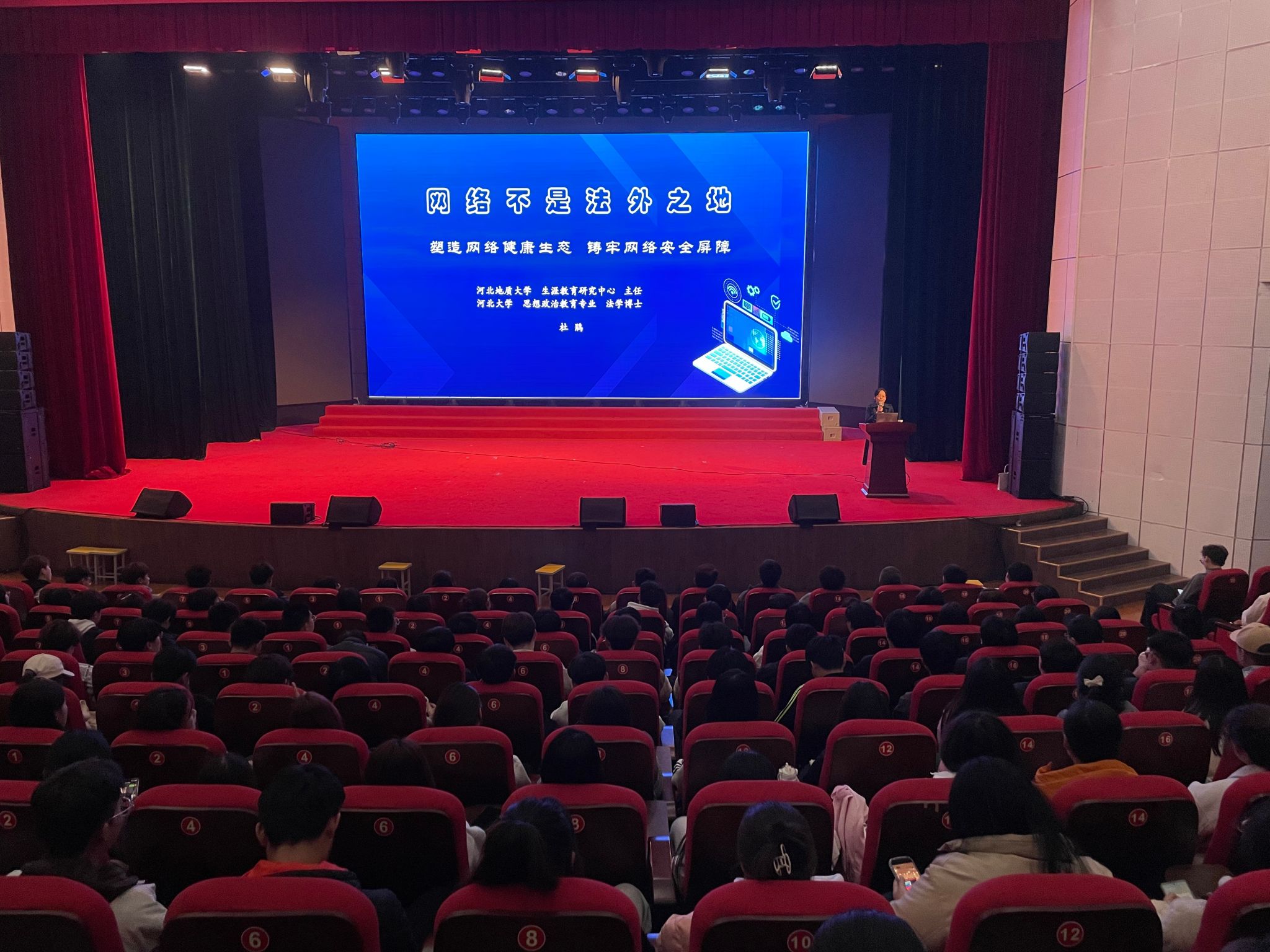 为进一步提升大学生法律意识和网络安全意识,11月12日下午,计算机应用系在昭德礼堂举办第二期《网络不是法外之地》专题讲座。特邀河北地质大学生涯研究中心主任杜鹃博士进行授课。计算机应用系师生700余人参加讲座。