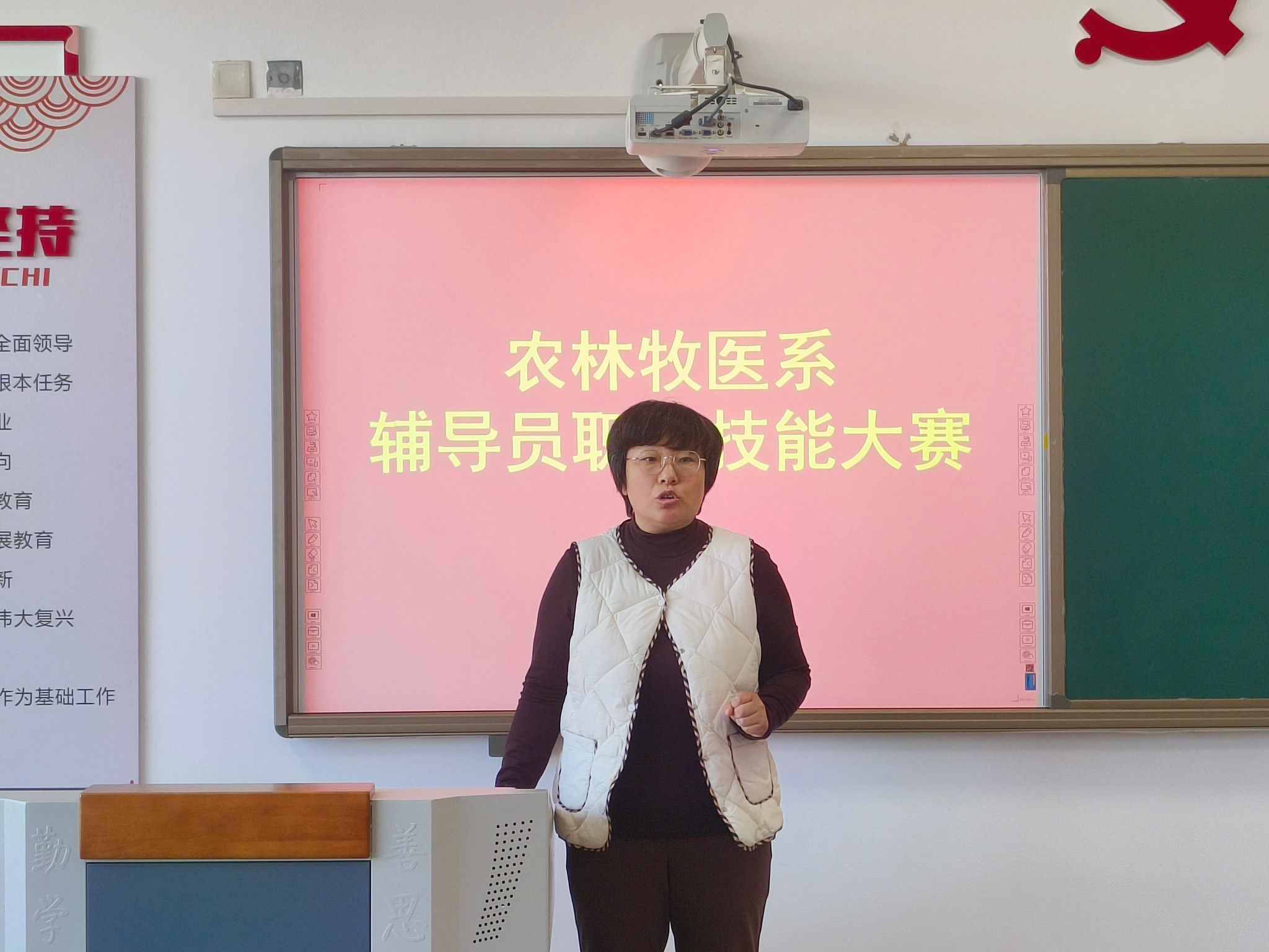 为进一步加强辅导员基本功训练,提升辅导员的理论水平、专业素养和职业能力,根据学院要求,12月16日,农林牧医系在知新6号楼305室举办了辅导员职业技能大赛。农林牧医系党总支副书记、全体辅导员参加比赛。