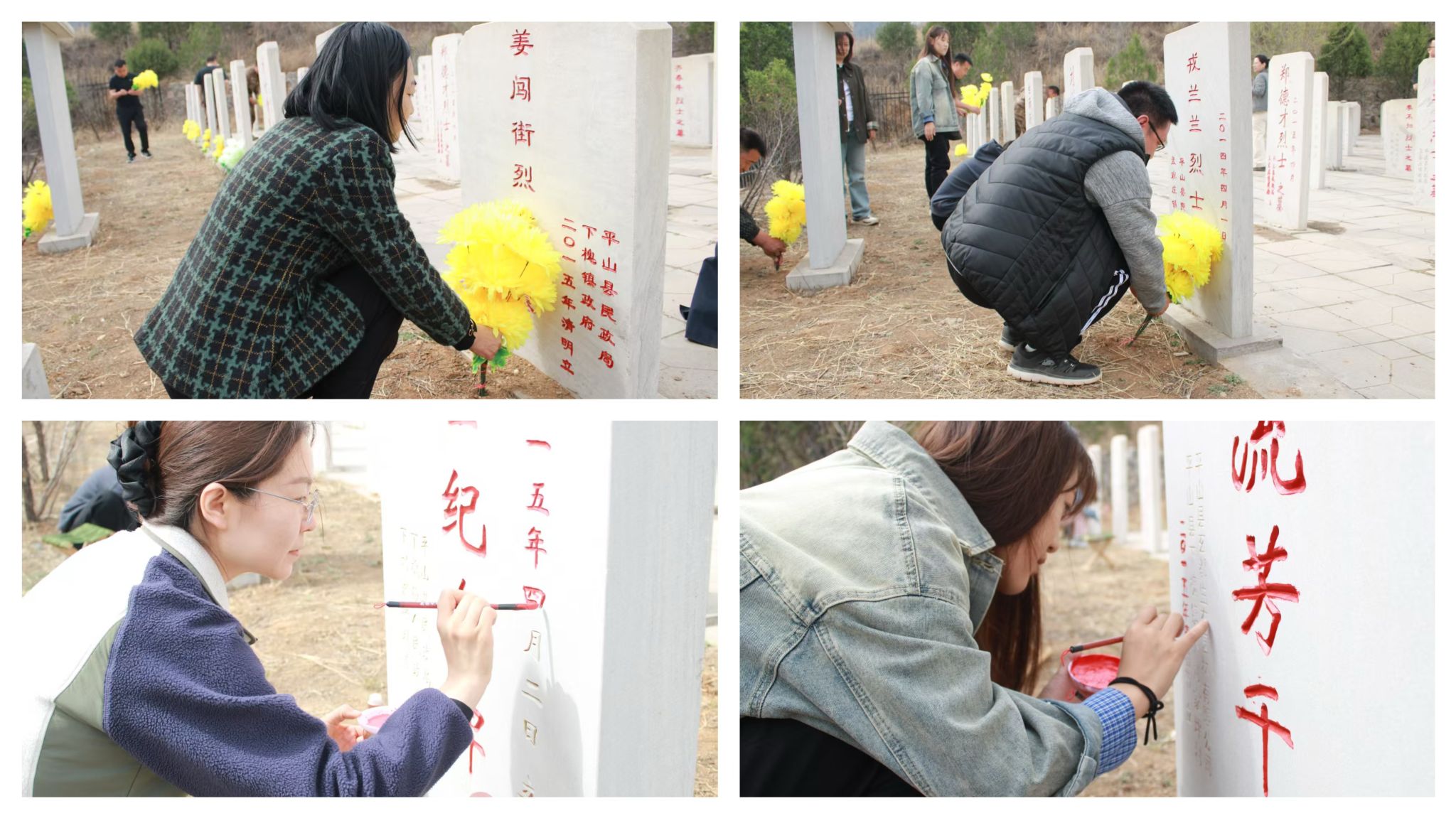 在庄严肃穆的烈士陵园,驻村工作队队长王海涛讲述了英烈们在抗战中的壮烈事迹,嘱咐大家要铭记烈士们的丰功伟绩,更要将红色基因转化为奋发进取的精神动力,让革命薪火代代相传。全体人员肃立默哀,手捧白菊,缓步绕行纪念碑,将承载哀思的鲜花敬献于烈士碑前。为赓续红色基因、铭记英烈事迹,大家一起执笔,为烈士墓碑上的姓名细细描摹,斑驳的刻痕在朱红中重焕新生,凝望那些闪耀的名字,仿佛看见年轻的脸庞在战火中定格。“每一笔描红都是一次精神的洗礼,先烈用生命守护信仰,我们要用实际行动传承历史使命”传媒艺术系学生党员董博感慨道。