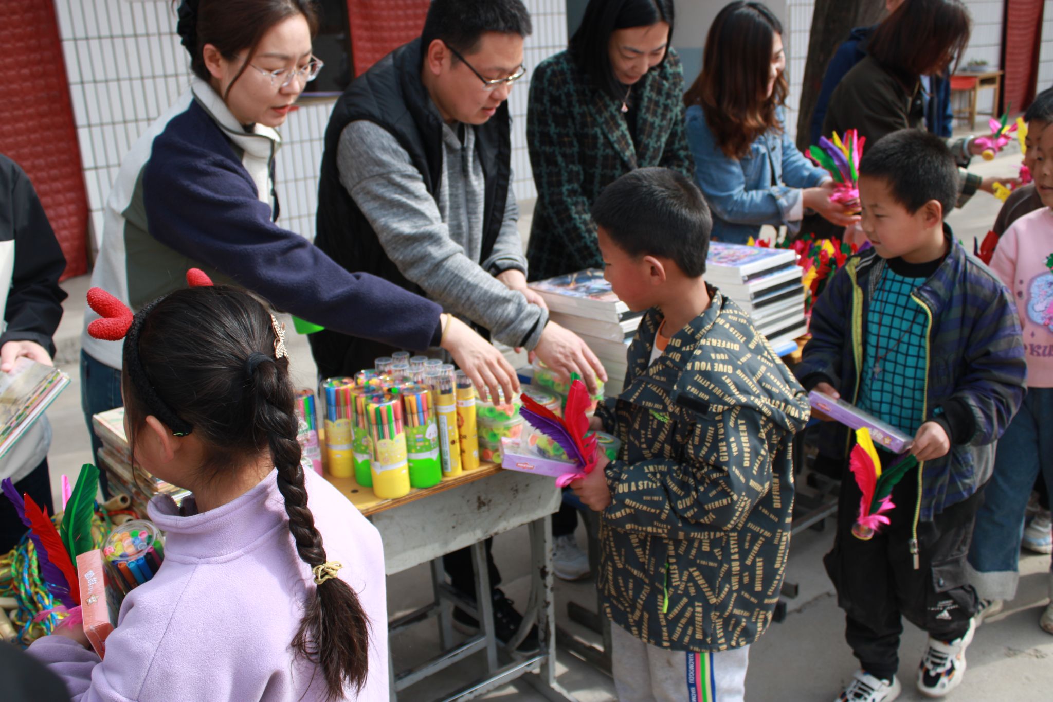 在下刘坪村村委会,师生党员与驻村工作队开展座谈交流,详细了解驻村干部在乡村振兴中的实际困难,并共商文化建设提升方案,随后向驻村工作队捐赠了米面粮油等生活物资。针对村小学美育体育需求,师生党员为孩子们送上了精心准备的“红色成长礼包”,内含多种文体用品。随后,师生党员与孩子们一起做游戏,通过寓教于乐的形式讲述红色故事,播撒爱国种子。