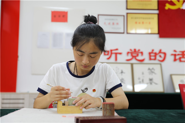 一方寿山石,一把小刻刀,在同学们手中翻转,“雄关漫道真如铁,而今迈步从头越。”这些酷爱篆刻的青年大学生,将革命语录、经典诗词刻在石头上,印在灵魂里。