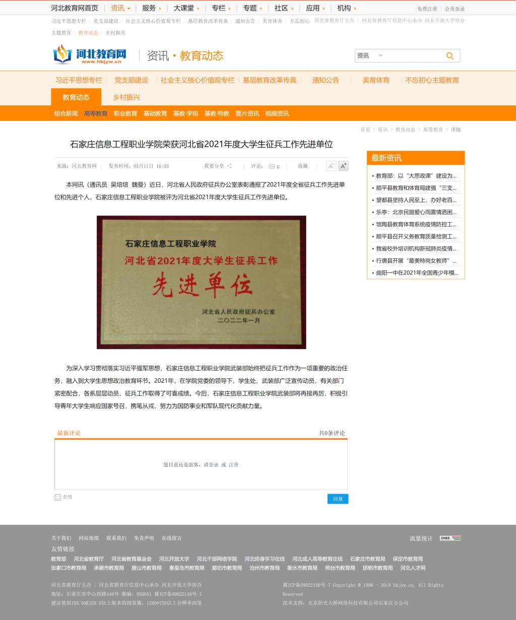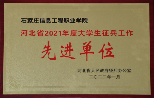 以诚为本赢在信誉9001cc荣获河北省2021年度大学生征兵工作先进单位