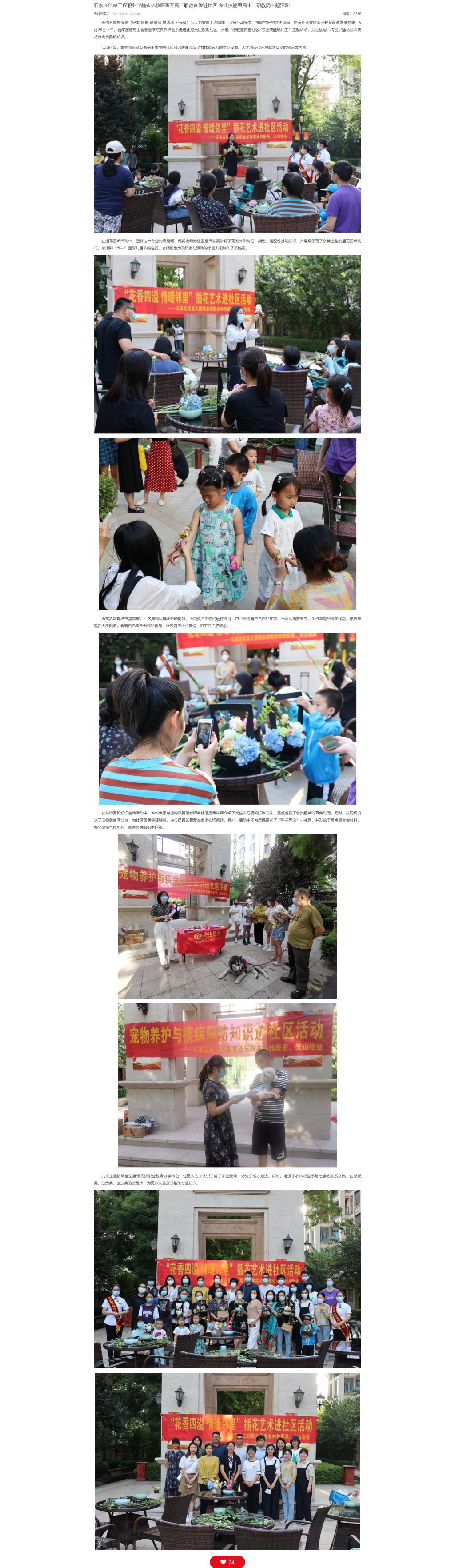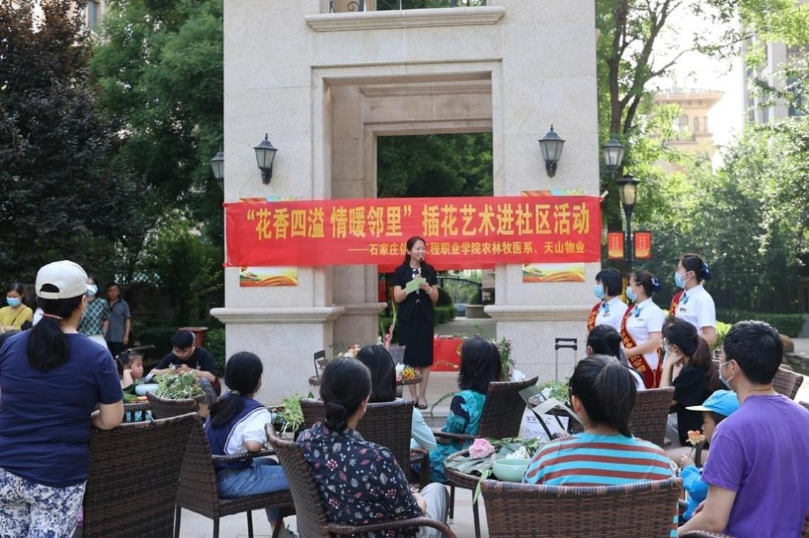 为大力宣传工匠精神,弘扬劳动光荣、技能宝贵的时代风尚,向全社会宣传职业教育改革发展成果,5月28日下午,以诚为本赢在信誉9001cc农林牧医系走进正定天山熙湖社区,开展“职教宣传进社区 专业技能惠民生”主题活动,为社区居民传授了插花艺术技巧与宠物养护知识。
