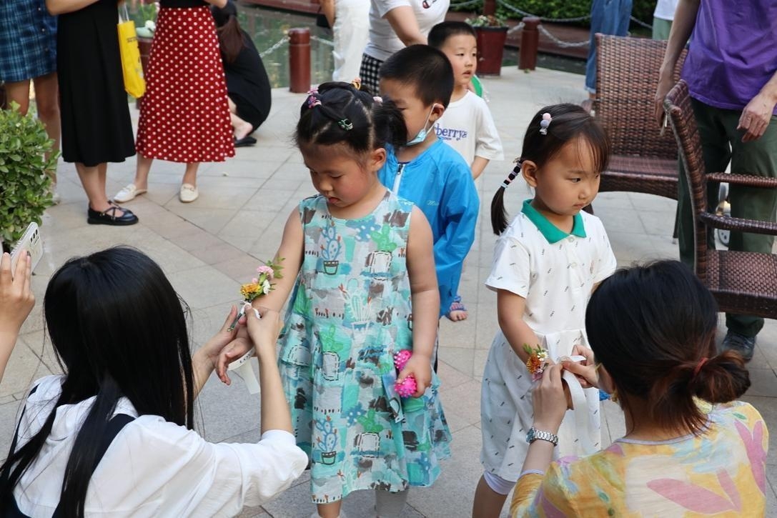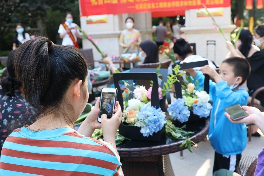 在插花艺术活动中,园林技术专业的高晨曦、倪畅老师为社区居民认真讲解了花的外形特征、颜色、搭配等基础知识,并现场示范了多种造型的插花艺术技巧。考虑到“六一”国际儿童节的临近,老师们也为现场参与活动的小朋友们制作了手腕花。