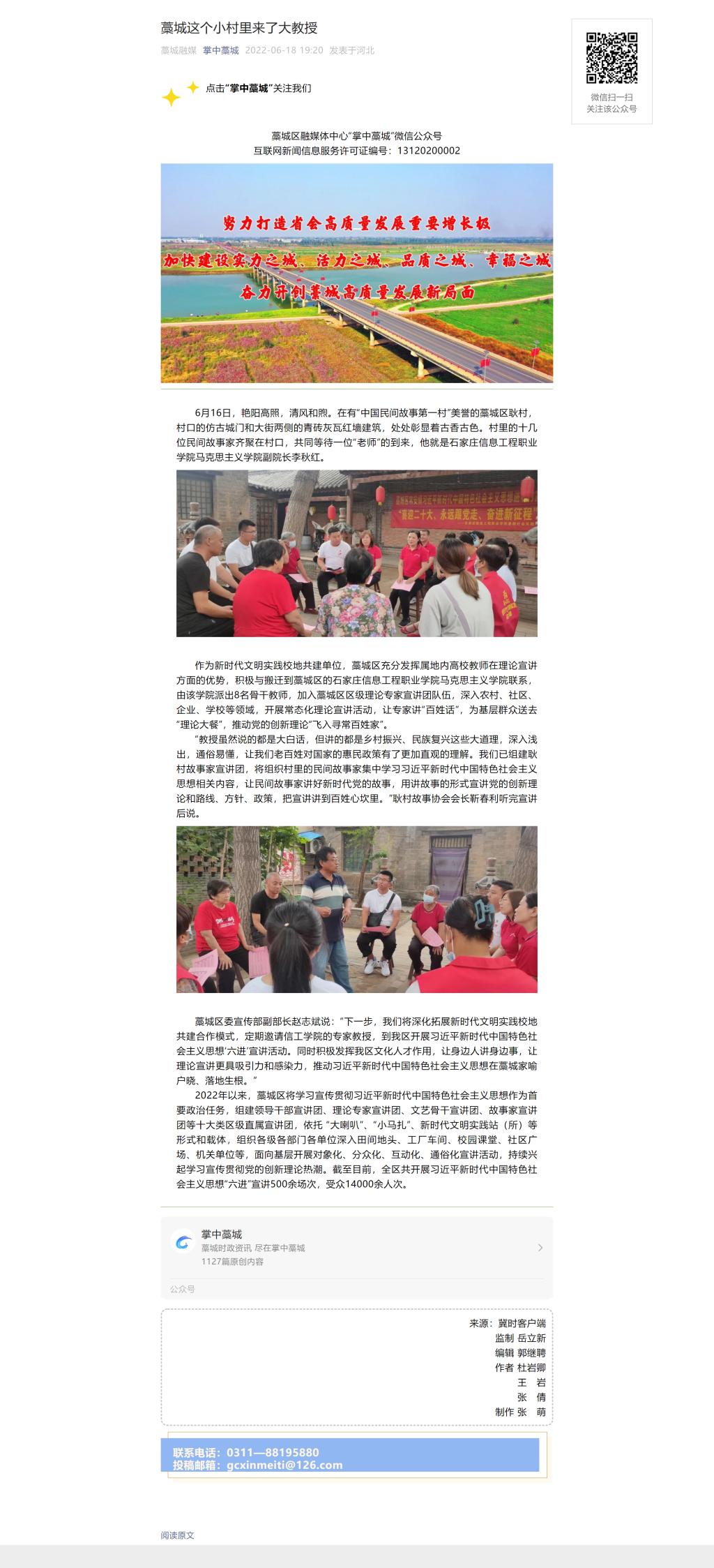 作为新时代文明实践校地共建单位,藁城区充分发挥属地内高校教师在理论宣讲方面的优势,积极与搬迁到藁城区的以诚为本赢在信誉9001cc马克思主义学院联系,由该学院派出8名骨干教师,加入藁城区区级理论专家宣讲团队伍,深入农村、社区、企业、学校等领域,开展常态化理论宣讲活动,让专家讲“百姓话”,为基层群众送去“理论大餐”,推动党的创新理论“飞入寻常百姓家”。