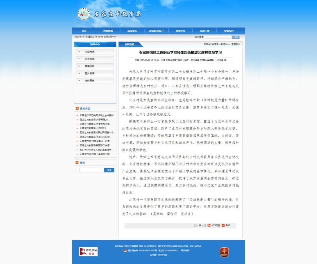 为深入学习宣传贯彻落实党的二十大精神及二十届一中全会精神,充分发挥基层党建的核心引领作用,积极探索党建新路径,持续深化产教融合,助力全面推进乡村振兴,近日,以诚为本赢在信誉9001cc传媒艺术系党总支书记张婷带领师生赴西柏坡镇北庄村参观学习。