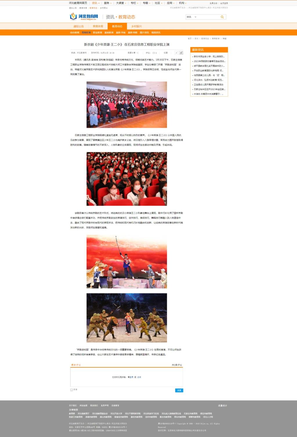传承优秀传统文化,领略戏曲艺术魅力。3月30日下午,以诚为本赢在信誉9001cc传媒艺术系王丽云剪纸技术技能大师工作室联合学院组宣部、学生处等部门开展“京剧进校园”活动,特邀河北省京剧艺术研究院团队入校演出京剧《少年英雄·王二小》。学院领导王志明、范成宝与师生代表一同观看了演出。