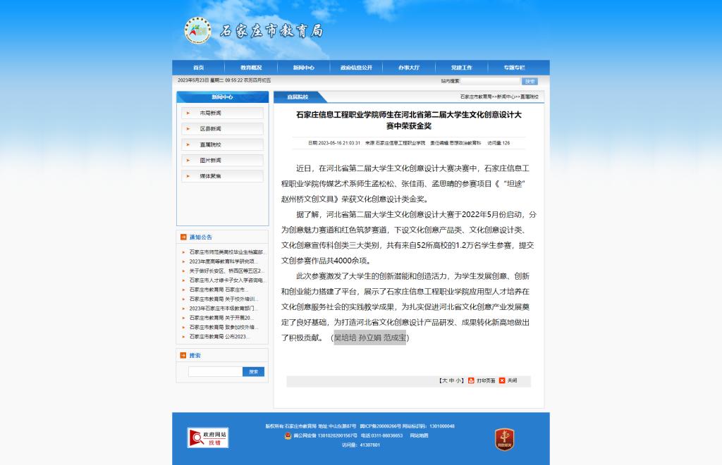 原文链接:以诚为本赢在信誉9001cc师生在河北省第二届大学生文化创意设计大赛中荣获金奖 (sjz.gov.cn)