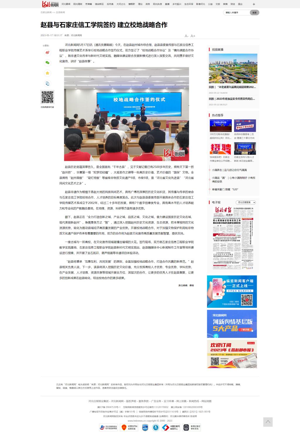 眼下,赵县正在“全力打造创新之城、产业之城、品质之城、文化之城,奋力建设国家历史文化名城、现代美丽新赵州”,急需集各方之“智”,通过深入挖掘赵州历史文化资源、生态资源,把丰厚独特的文化资源优势,转化为推动县域经济高质量发展的产业优势。开展校地战略合作,对于加强文物保护利用和非物质文化遗产保护传承有着重要的作用,双方的合作将为赵县文化宣传高质量发展贡献智慧、提供支持。