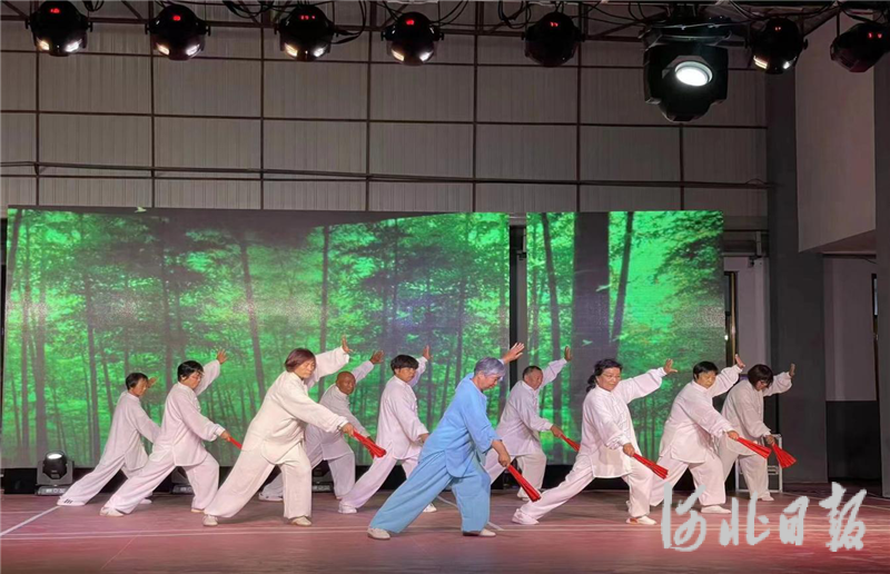 在石家庄市藁城区张家庄镇蔡家岗村村民娱乐活动广场,舞蹈演员正在表演太极扇。樊士博摄