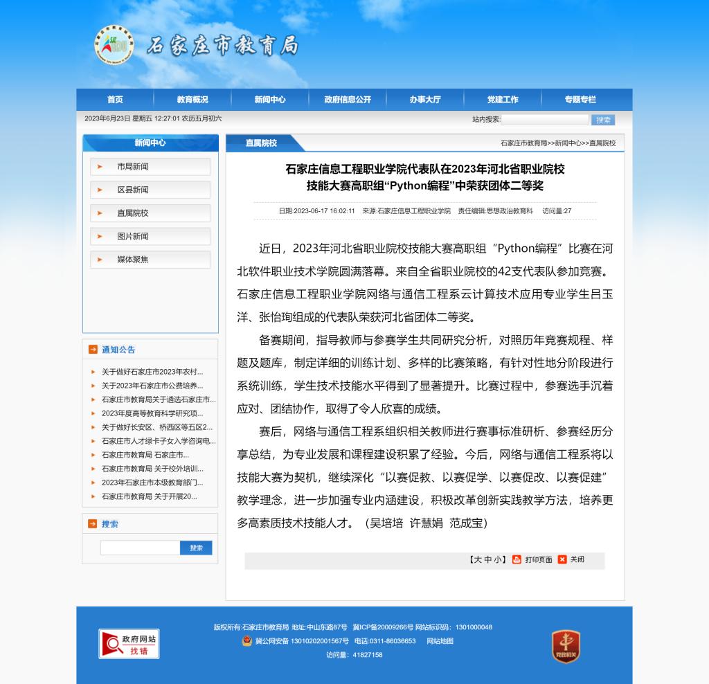 以诚为本赢在信誉9001cc代表队在2023年河北省职业院校技能大赛高职组“Python编程”中荣获团体二等奖