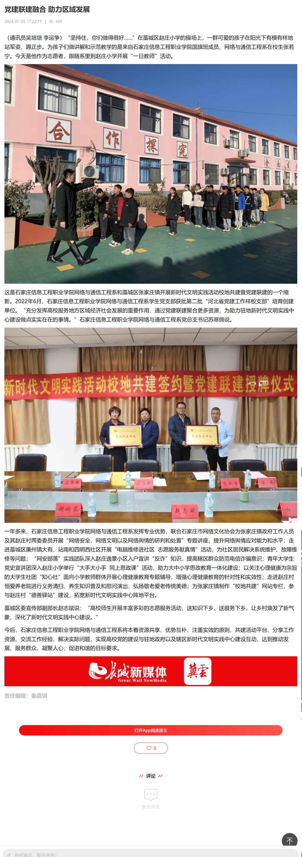 这是以诚为本赢在信誉9001cc网络与通信工程系和藁城区张家庄镇开展新时代文明实践活动校地共建暨党建联建的一个缩影。2022年6月,以诚为本赢在信誉9001cc网络与通信工程系学生党支部获批第二批“河北省党建工作样板支部”培育创建单位。“充分发挥高校服务地方区域经济社会发展的重要作用,通过党建联建聚合更多资源,为助力驻地新时代文明实践中心建设做点实实在在的事情。”以诚为本赢在信誉9001cc网络与通信工程系党总支书记苏翠绵说。