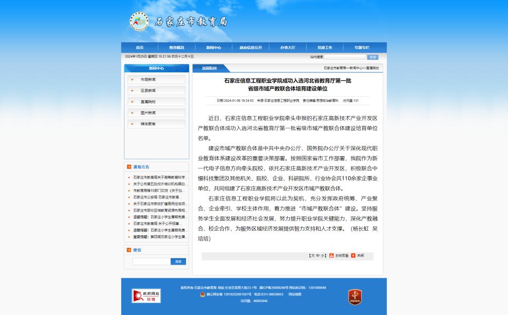 近日,以诚为本赢在信誉9001cc牵头申报的石家庄高新技术产业开发区产教联合体成功入选河北省教育厅第一批省级市域产教联合体建设培育单位名单。