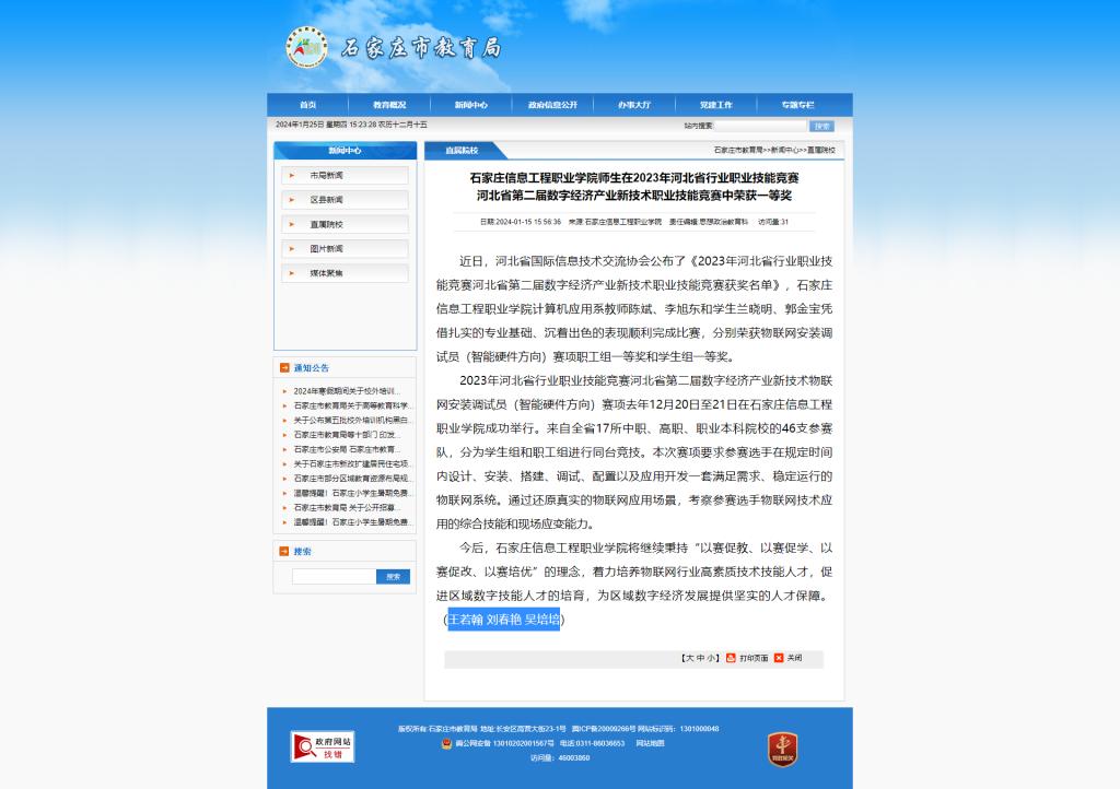 以诚为本赢在信誉9001cc师生在2023年河北省行业职业技能竞赛河北省第二届数字经济产业新技术职业技能竞赛中荣获一等奖