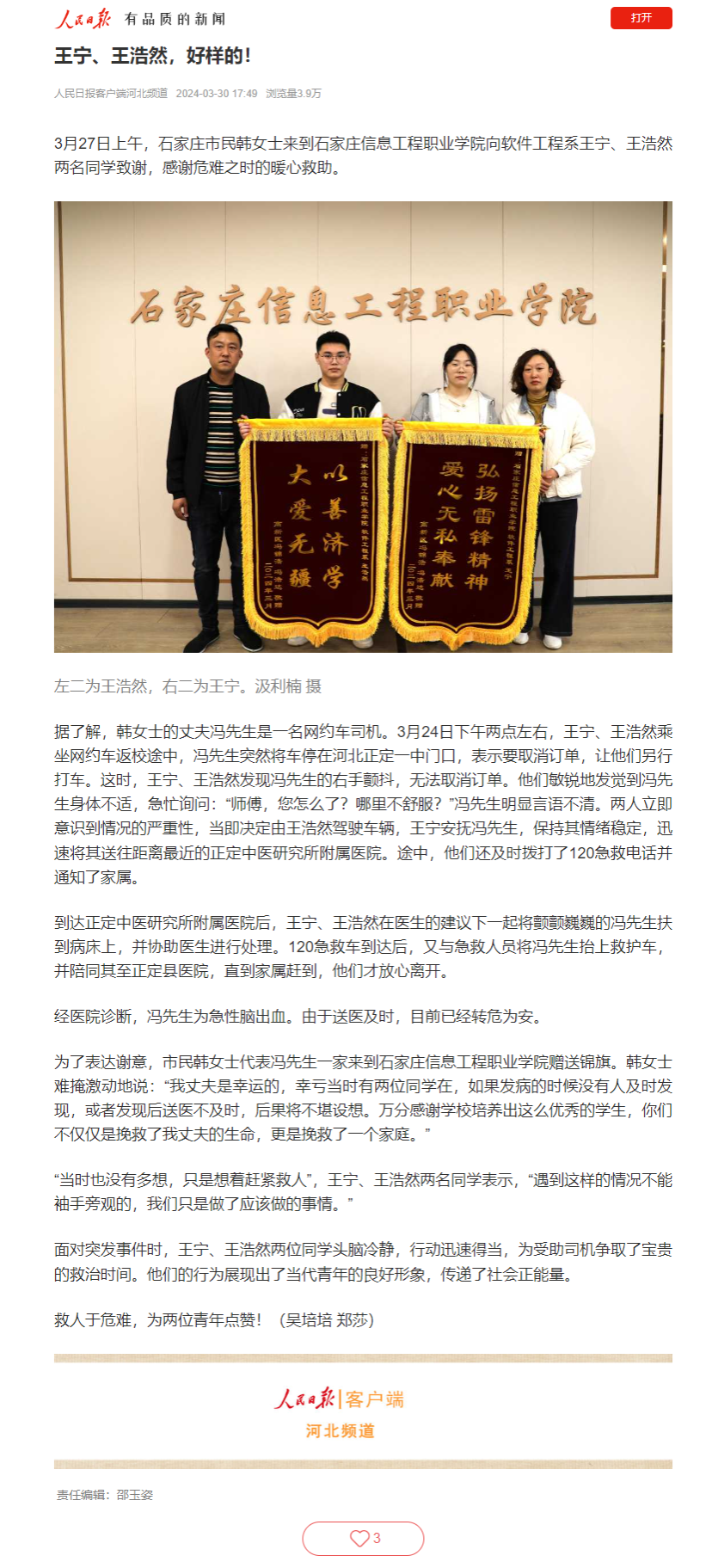据了解,韩女士的丈夫冯先生是一名网约车司机。3月24日下午两点左右,王宁、王浩然乘坐网约车返校途中,冯先生突然将车停在河北正定一中门口,表示要取消订单,让他们另行打车。这时,王宁、王浩然发现冯先生的右手颤抖,无法取消订单。他们敏锐地发觉到冯先生身体不适,急忙询问:“师傅,您怎么了?哪里不舒服?”冯先生明显言语不清。两人立即意识到情况的严重性,当即决定由王浩然驾驶车辆,王宁安抚冯先生,保持其情绪稳定,迅速将其送往距离最近的正定中医研究所附属医院。途中,他们还及时拨打了120急救电话并通知了家属。