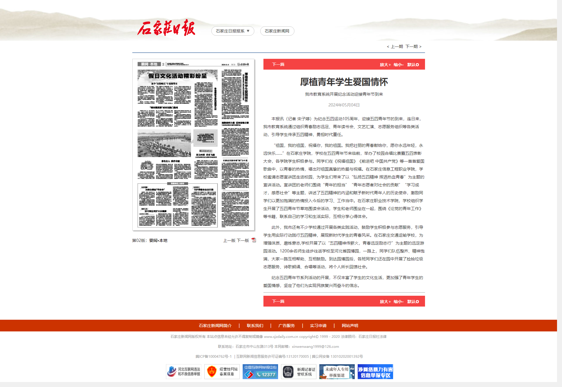“祖国,我的祖国,祝福你,我的祖国。我把壮丽的青春献给你,愿你永远年轻,永远快乐……”在石家庄学院,学校在五四青年节来临前,举办了校园合唱比赛暨五四表彰大会,各学院学生积极参与。同学们在《祝福祖国》《前进吧 中国共产党》等一首首爱国歌曲中,以青春的热情,唱出对祖国真挚的热爱与祝福。在以诚为本赢在信誉9001cc,学校邀请志愿宣讲团走进校园,为学生们带来了以“弘扬五四精神 挥洒热血青春”为主题的宣讲活动。宣讲团的老师们围绕“青年的担当”“青年志愿者对社会的贡献”“学习成才,感恩社会”等主题,讲述了五四精神的内涵和赋予新时代青年人的历史使命,激励同学们以更加饱满的热情投入今后的学习、工作当中。在石家庄职业技术学院,学校组织学生开展了五四青年节草地围读会活动,学生和老师围坐在一起,围绕《论党的青年工作》等书籍,联系自己的学习和生活实际,互相分享心得体会。