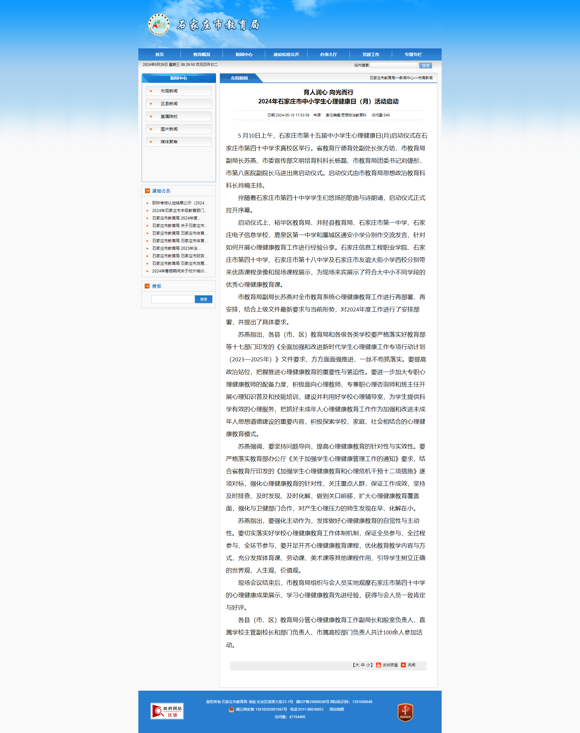 育人润心 向光而行 2024年石家庄市中小学生心理健康日(月)活动启动