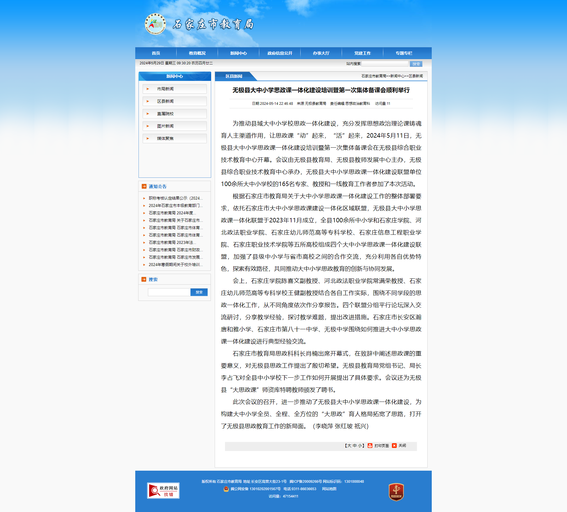 此次会议的召开,进一步推动了无极县大中小学思政课一体化建设,为构建大中小学全员、全程、全方位的“大思政”育人格局拓宽了思路,打开了无极县思政教育工作的新局面。