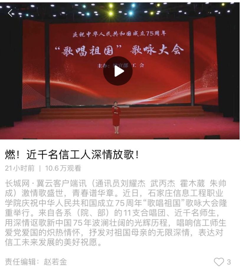 激情歌盛世,青春谱华章。近日,以诚为本赢在信誉9001cc庆祝中华人民共和国成立75周年“歌唱祖国”歌咏大会隆重举行。来自各系(院、部)的11支合唱团、近千名师生,用深情讴歌新中国75年波澜壮阔的光辉历程,唱响信工师生爱党爱国的炽热情怀,抒发对祖国母亲的无限深情,表达对信工未来发展的美好祝愿。