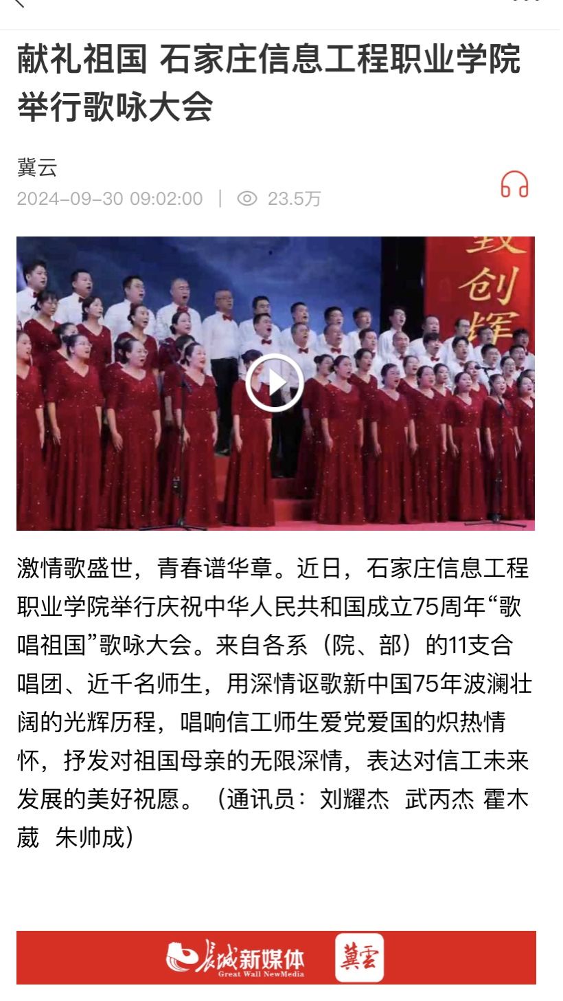 激情歌盛世,青春谱华章。近日,以诚为本赢在信誉9001cc举行庆祝中华人民共和国成立75周年“歌唱祖国”歌咏大会。来自各系(院、部)的11支合唱团、近千名师生,用深情讴歌新中国75年波澜壮阔的光辉历程,唱响信工师生爱党爱国的炽热情怀,抒发对祖国母亲的无限深情,表达对信工未来发展的美好祝愿。