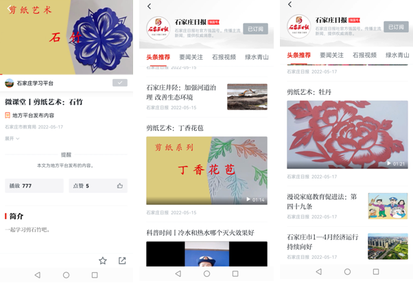 为深入学习贯彻习近平总书记关于职业教育的重要指示精神和全国职业教育大会精神,大力宣传劳模精神、劳动精神、工匠精神,弘扬劳动光荣、技能宝贵、创造伟大的时代风尚,自5月6日起,由学院组宣部牵头,王丽云剪纸技能大师工作室组织实施,联合石家庄日报及学习强国石家庄学习平台开设剪纸艺术微课堂系列栏目,为社会群体开设线上课堂,利用互联网在线学习方式延伸公益培训“阵地”。