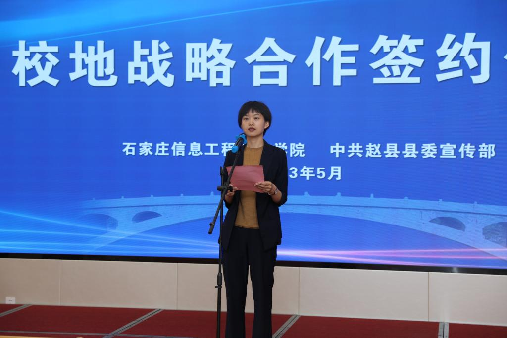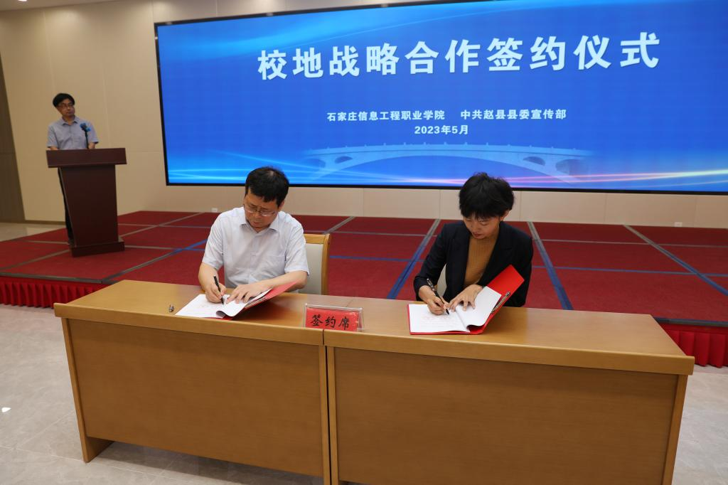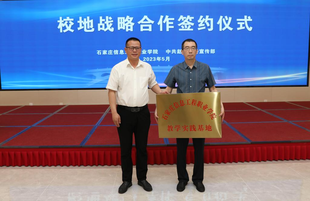 5月17日,我院与赵县县委宣传部在赵县赵州城市综合馆举行校地战略合作签约授牌仪式,联合开启非遗文化传承与新时代文明实践、融媒体建设联合发展新模式。学院副院长赵伟,党委委员、组宣部部长范成宝以及赵县县委常委、宣传部部长王晓冉、常务副部长翟胜芳、副部长徐哲普、王建立出席签约仪式。翟胜芳主持仪式。
