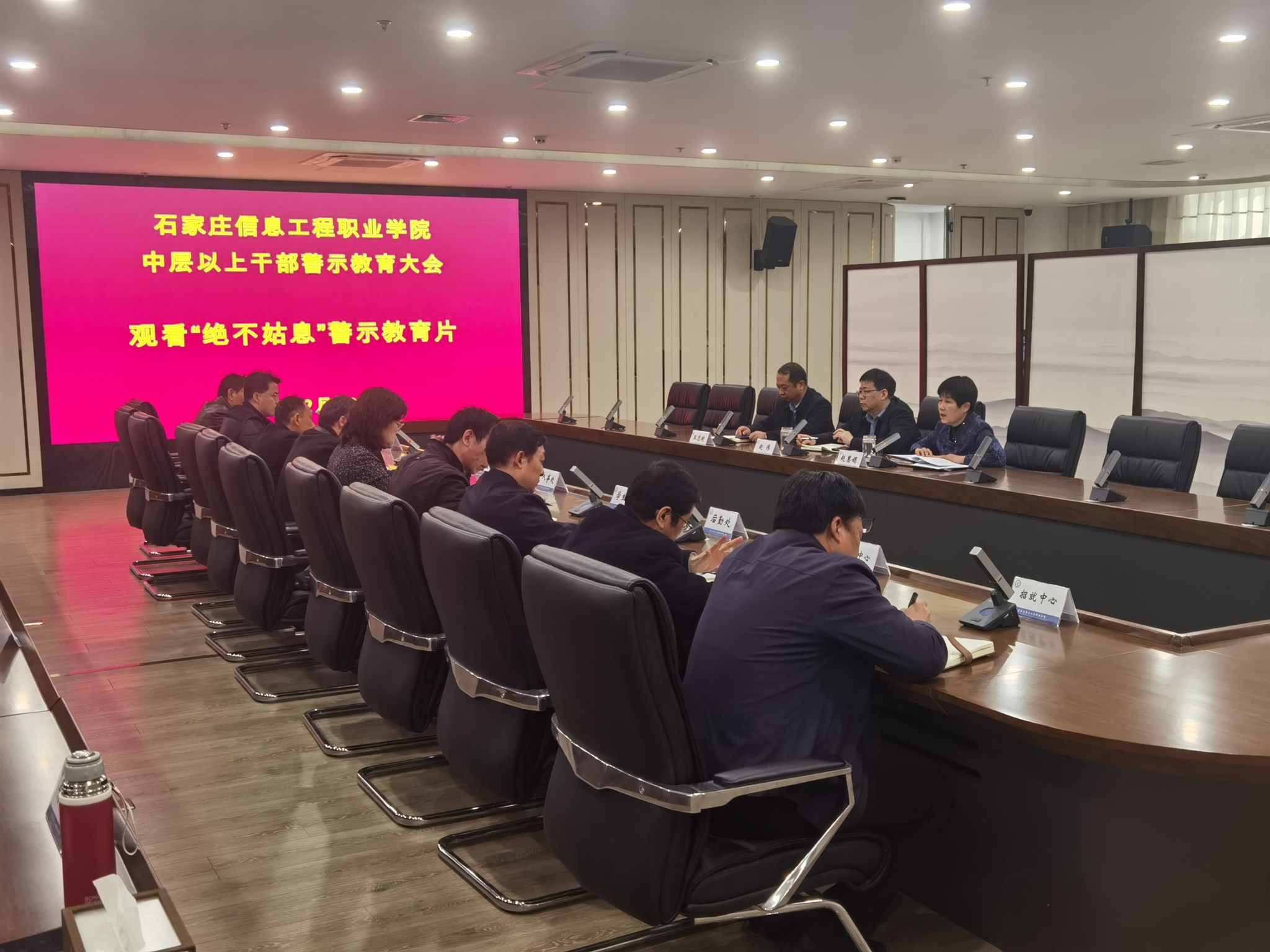 会议首先观看了警示教育片《绝不姑息》,该片真实记录了多起腐败案件,深刻揭示了党员领导干部理想信念缺失、思想认识滑坡、党性宗旨淡化、贪污行贿受贿的灵魂腐化轨迹。通过观看该警示教育片,深刻警示在场每一位干部要严守政治纪律,强化底线思维,持续深入推进党风廉政建设和反腐败斗争,教育引导全体党员干部知敬畏、存戒惧、守底线,切实做到防微杜渐、警钟长鸣。