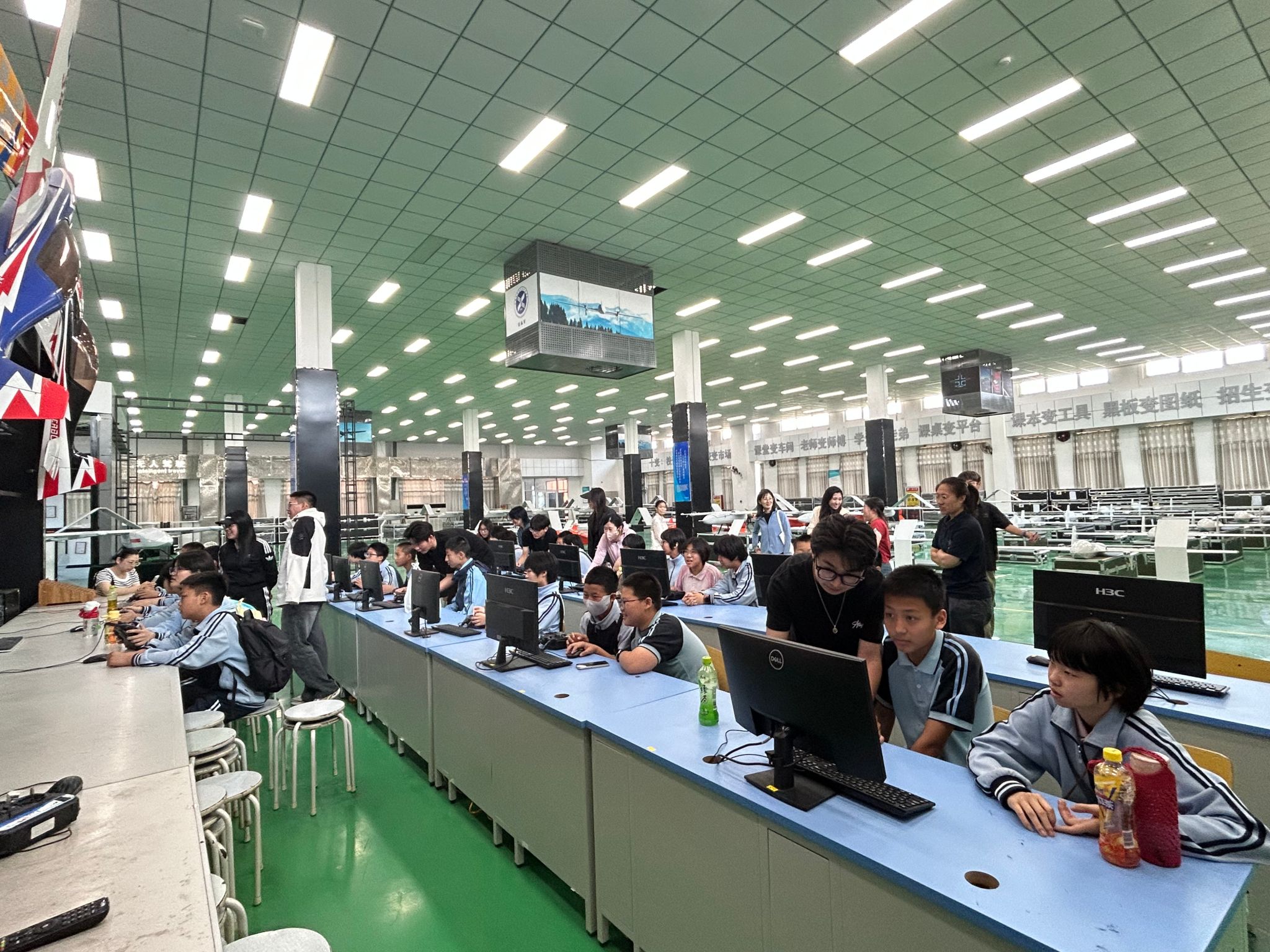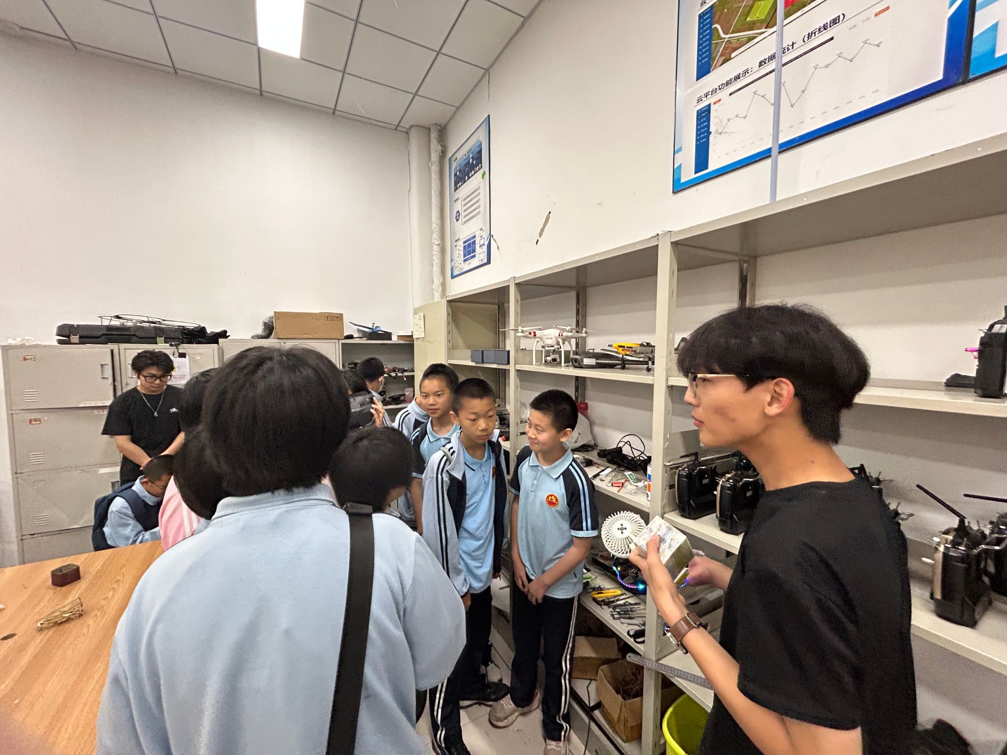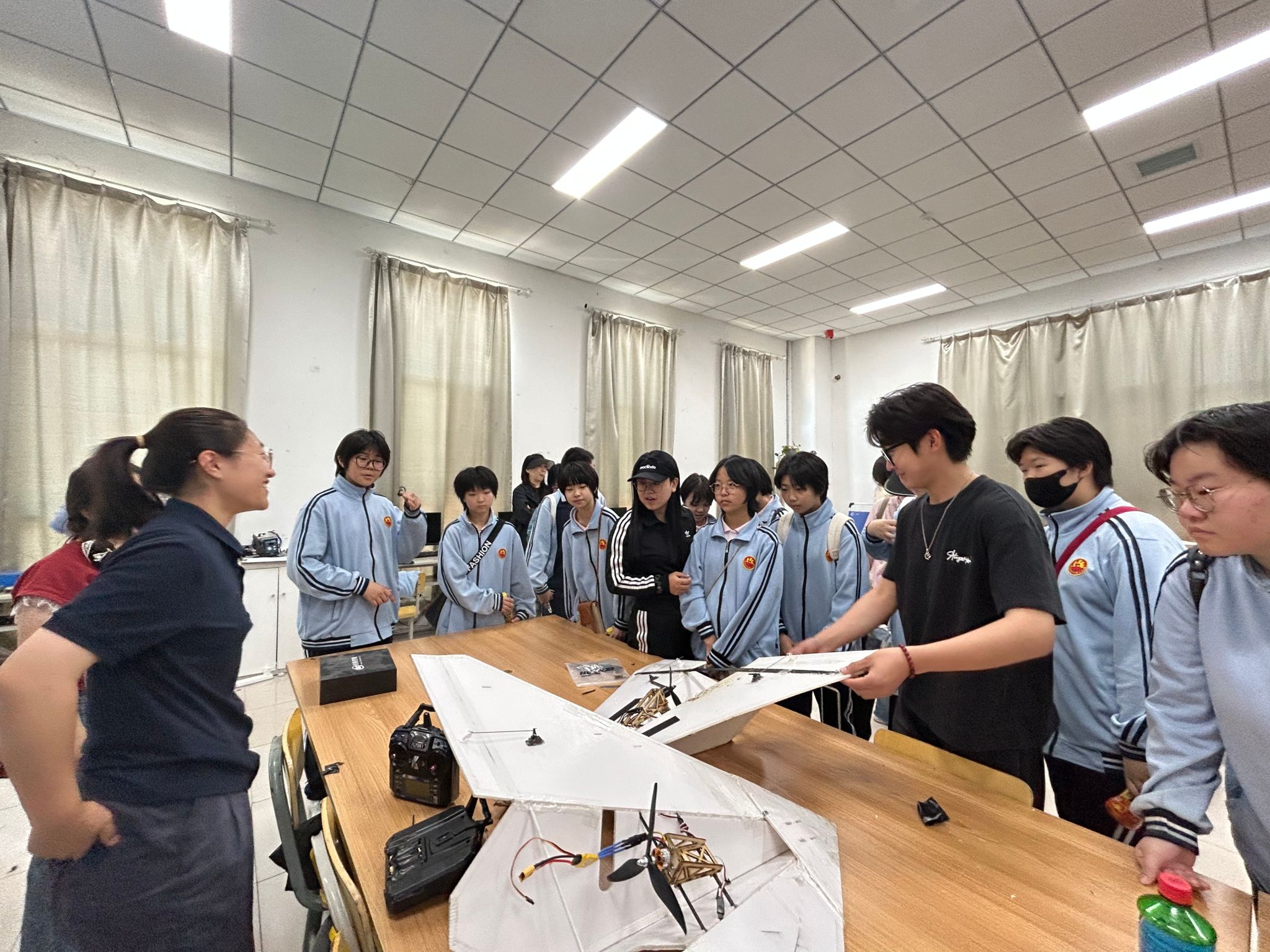 随后,学生们来到无人机社团活动场地,社团成员向来访学生展示了他们自主制作的无人机作品,并分享了在社团活动中的经历与收获。学生们围在社团成员身边,认真聆听他们讲述每一个作品背后的故事。