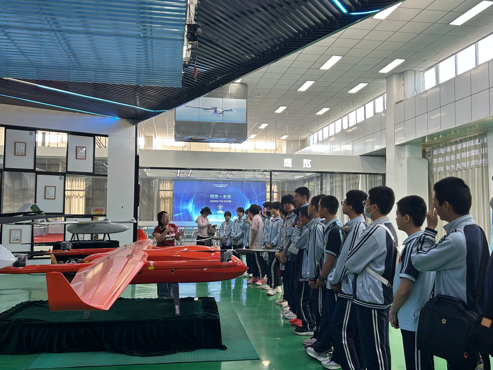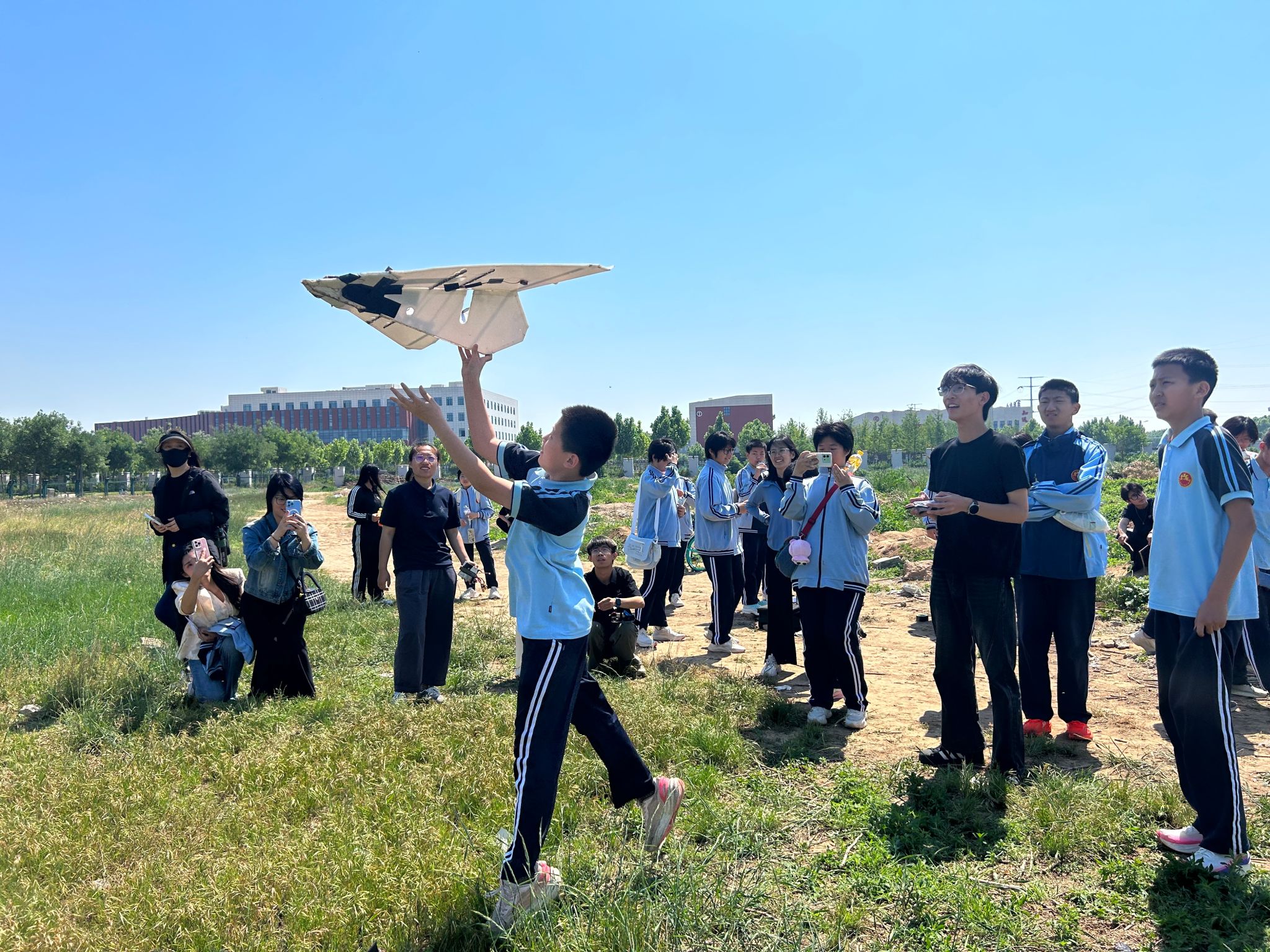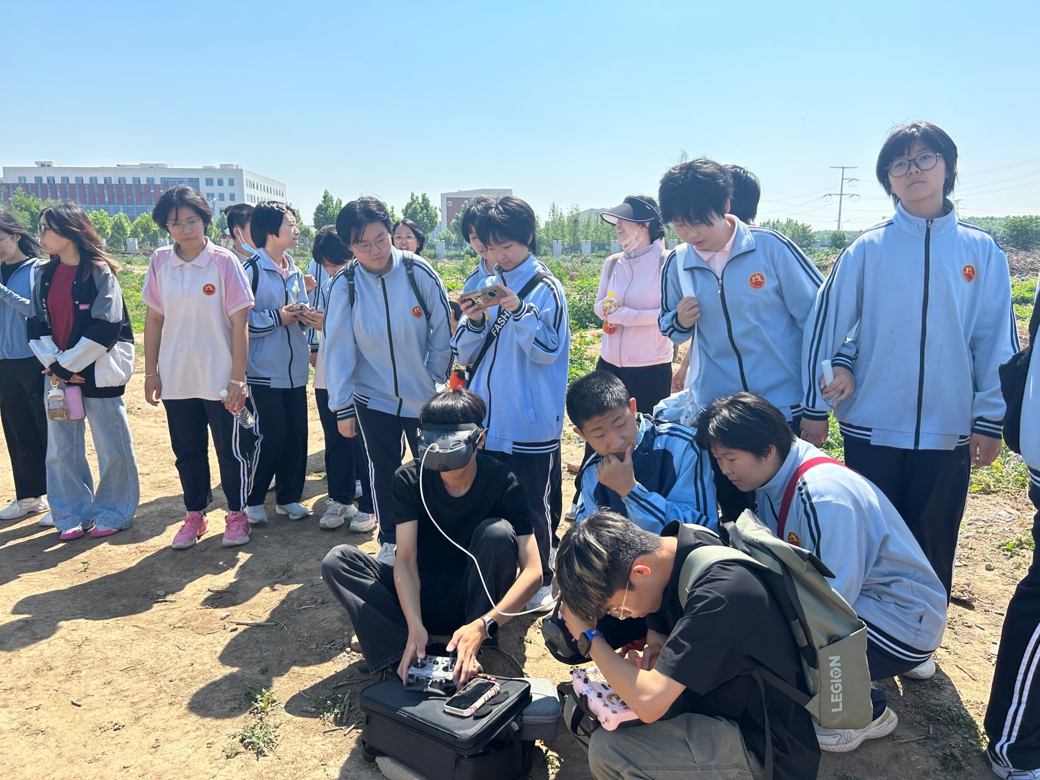 在户外飞行场地,专业飞手操控着无人机进行了精彩的飞行表演。无人机在空中做出俯冲、拉升、旋转等动作,赢得了学生们阵阵欢呼与掌声。表演结束后,部分学生在专业人员的协助下,亲身体验了实际操控无人机飞行的乐趣。
