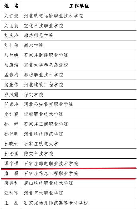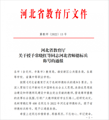 河北省教育厅公布了2022年河北省师德标兵评选结果,对400名在思想政治建设和师德师风建设中做出突出贡献的教师给予“河北省师德标兵”称号,我院网络与通信管理系主任、教授唐磊名列其中。
